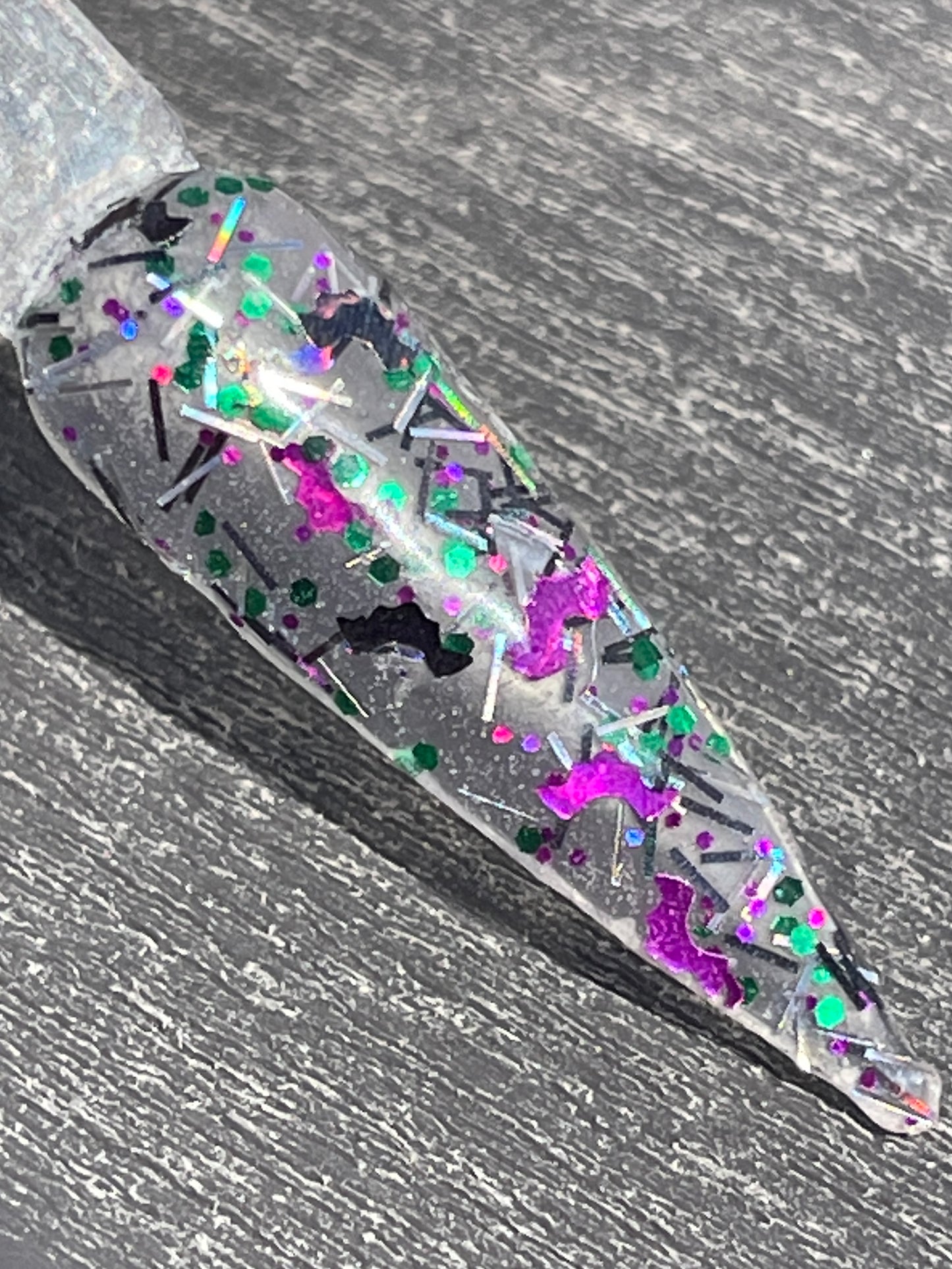 Batty About You is a clear base with purple, silver bats and silver and black glitter slivers