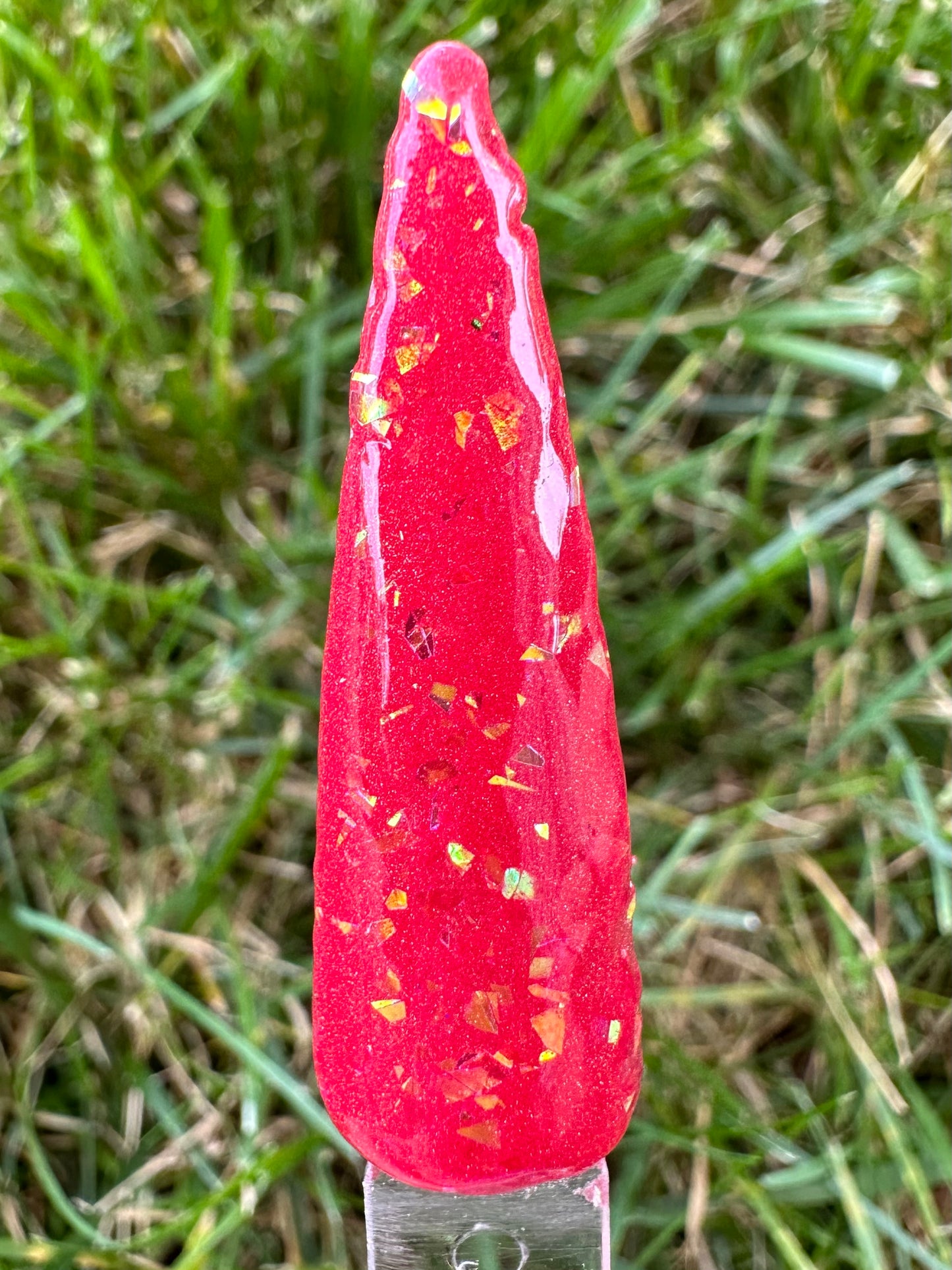 Burning Embers is a solid reddish orange base with gold glitter shards