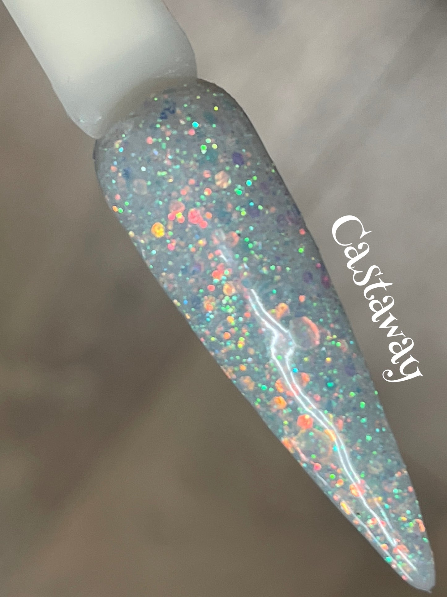 Castaway is a color shifting fine light minty blue glitter with chunky white opal glitter in a clear base.
