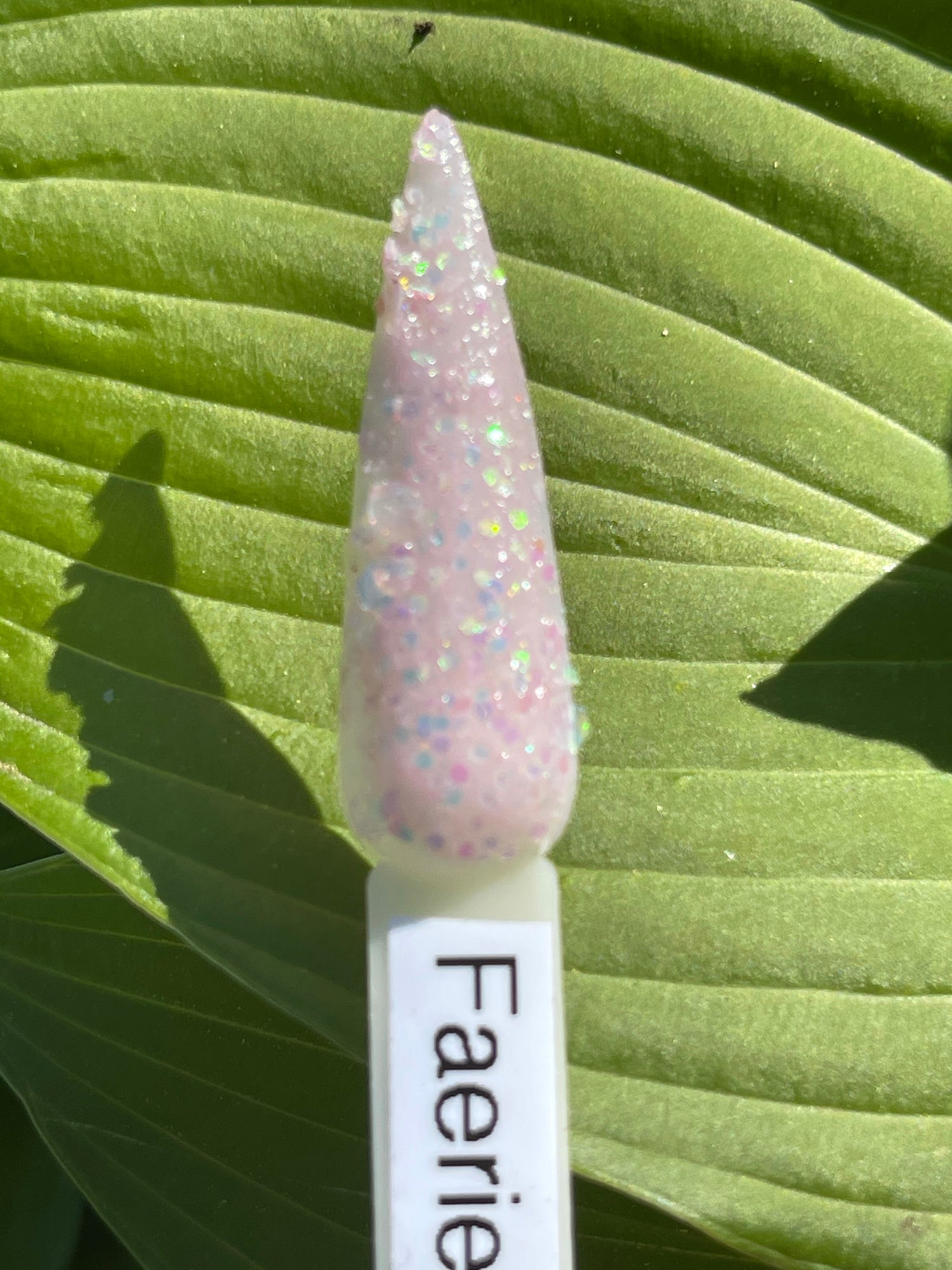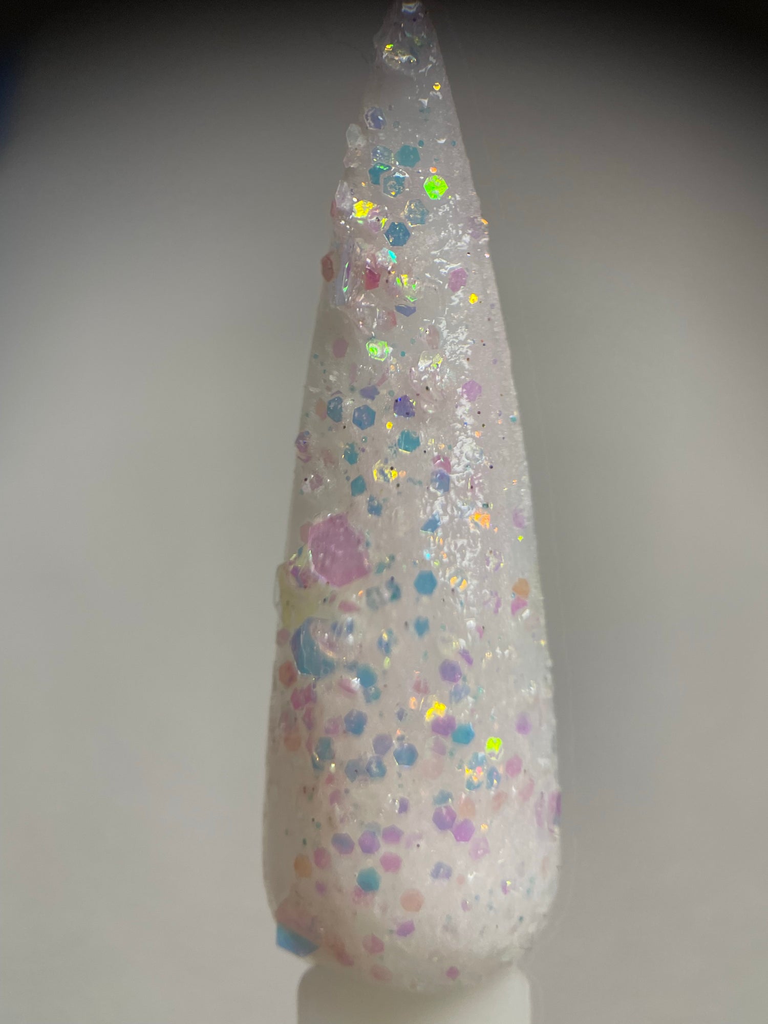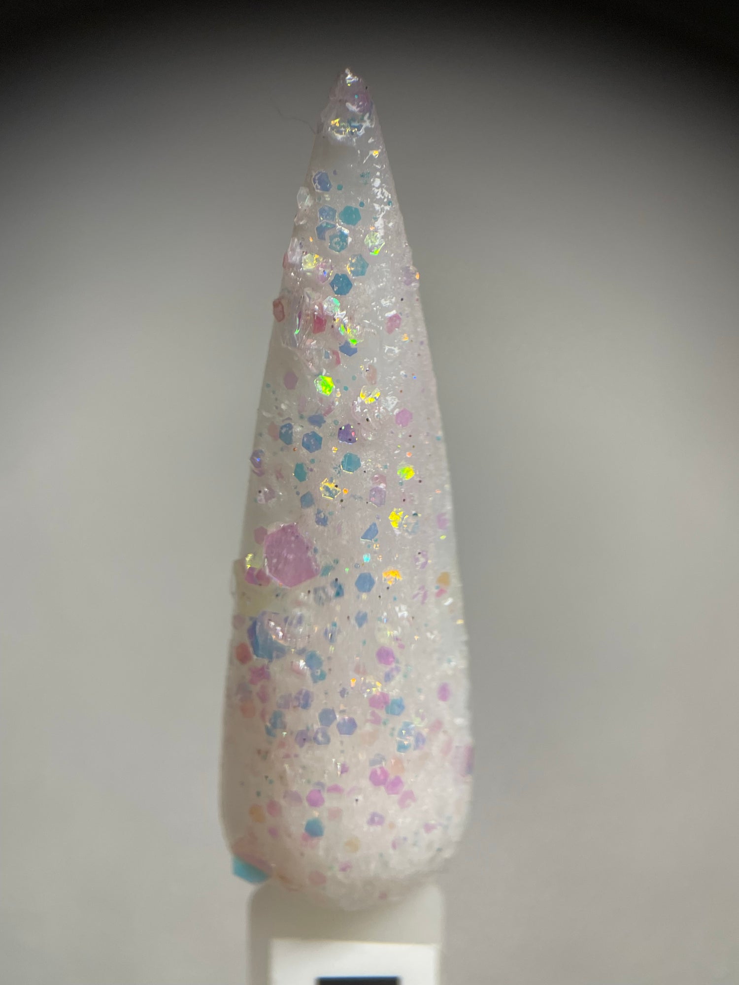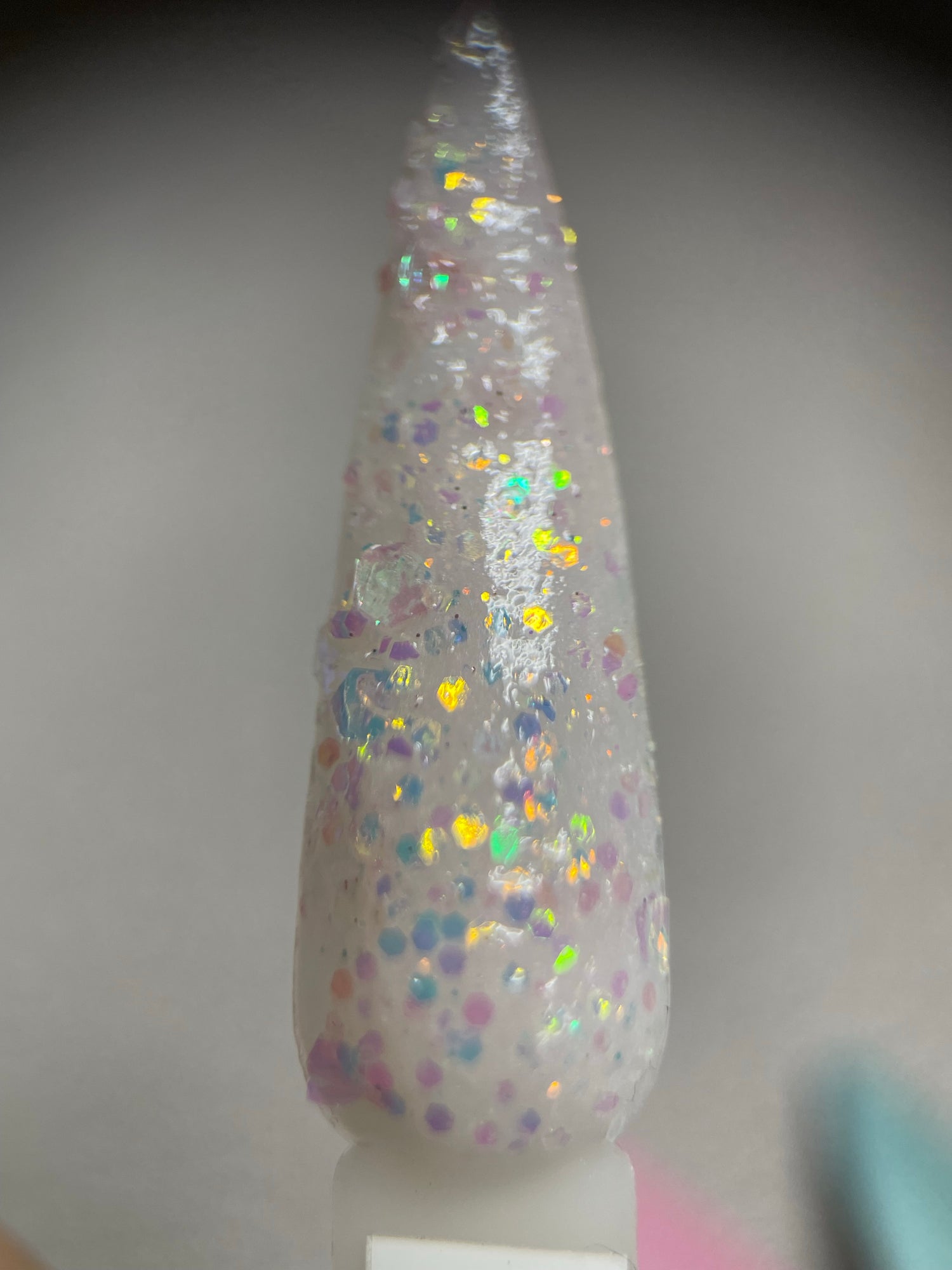 A classy white glittery dip with slight shift to pink in sun and uv light also glows!