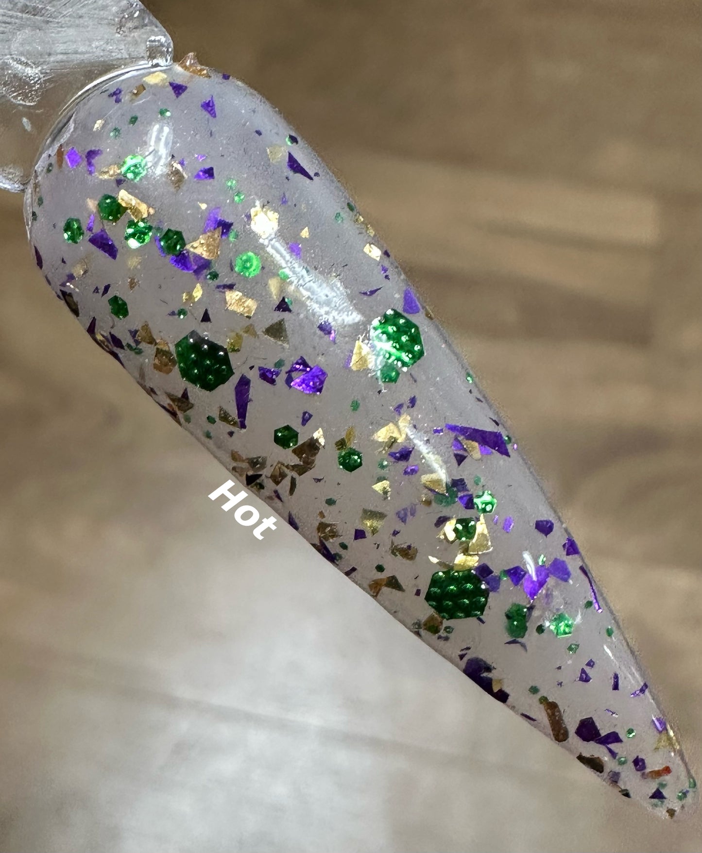 Fat Tuesdays Is a heat activated thermal that changes from yellow to clear when hot loaded with green waffle glitter, gold and purple flakes