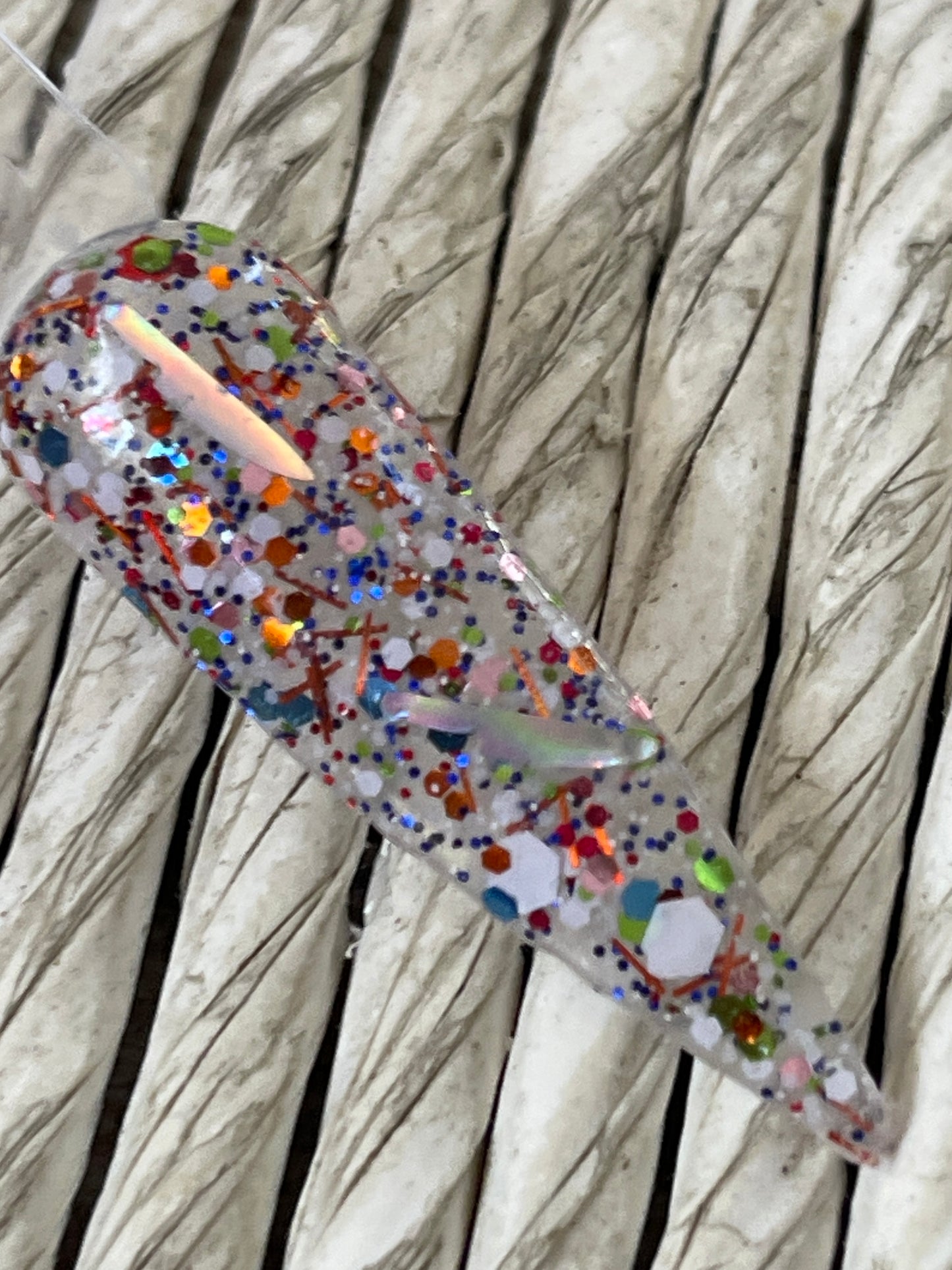 Friends Till The End is a clear base with different Size white, orange red and blue glitters. What would a child’s play dip be without the cute little knifes!
