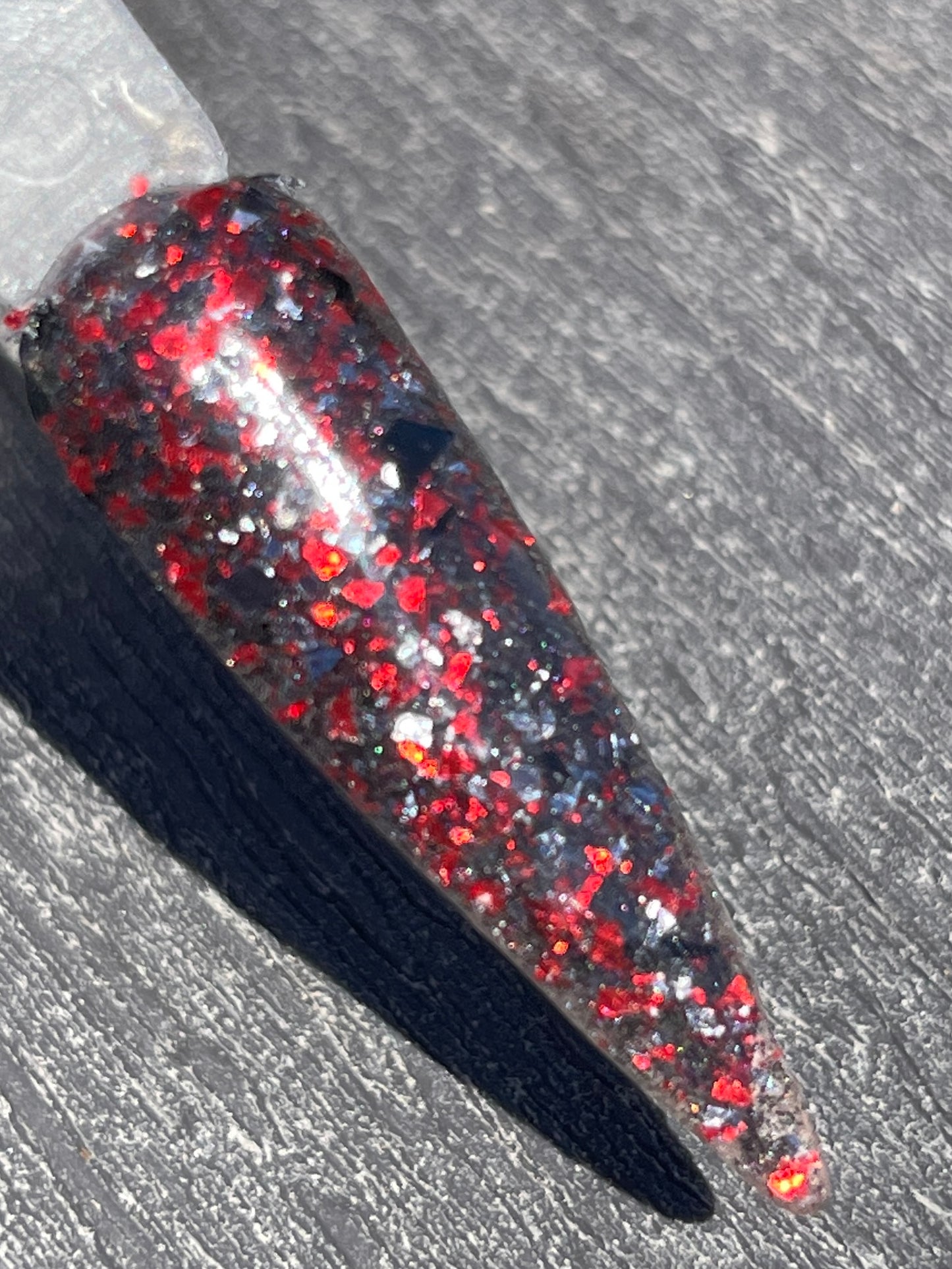 Hello Darkness My Old Friend is a clear base with fine black glitter loaded with red, black and gunmetal glitter shards