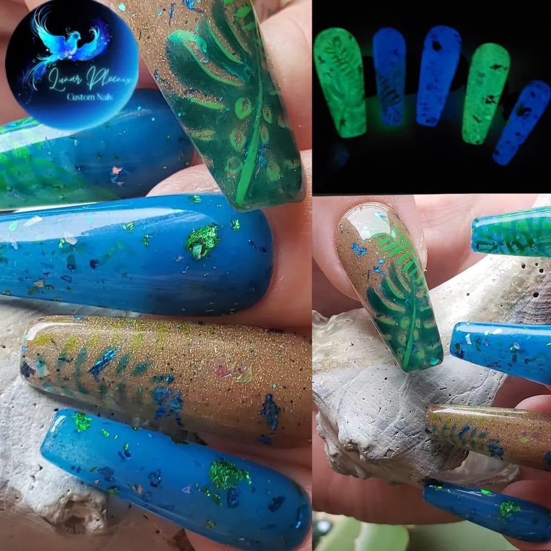 Hydra is a neon blue base with aqua flakes that glows when uv activated