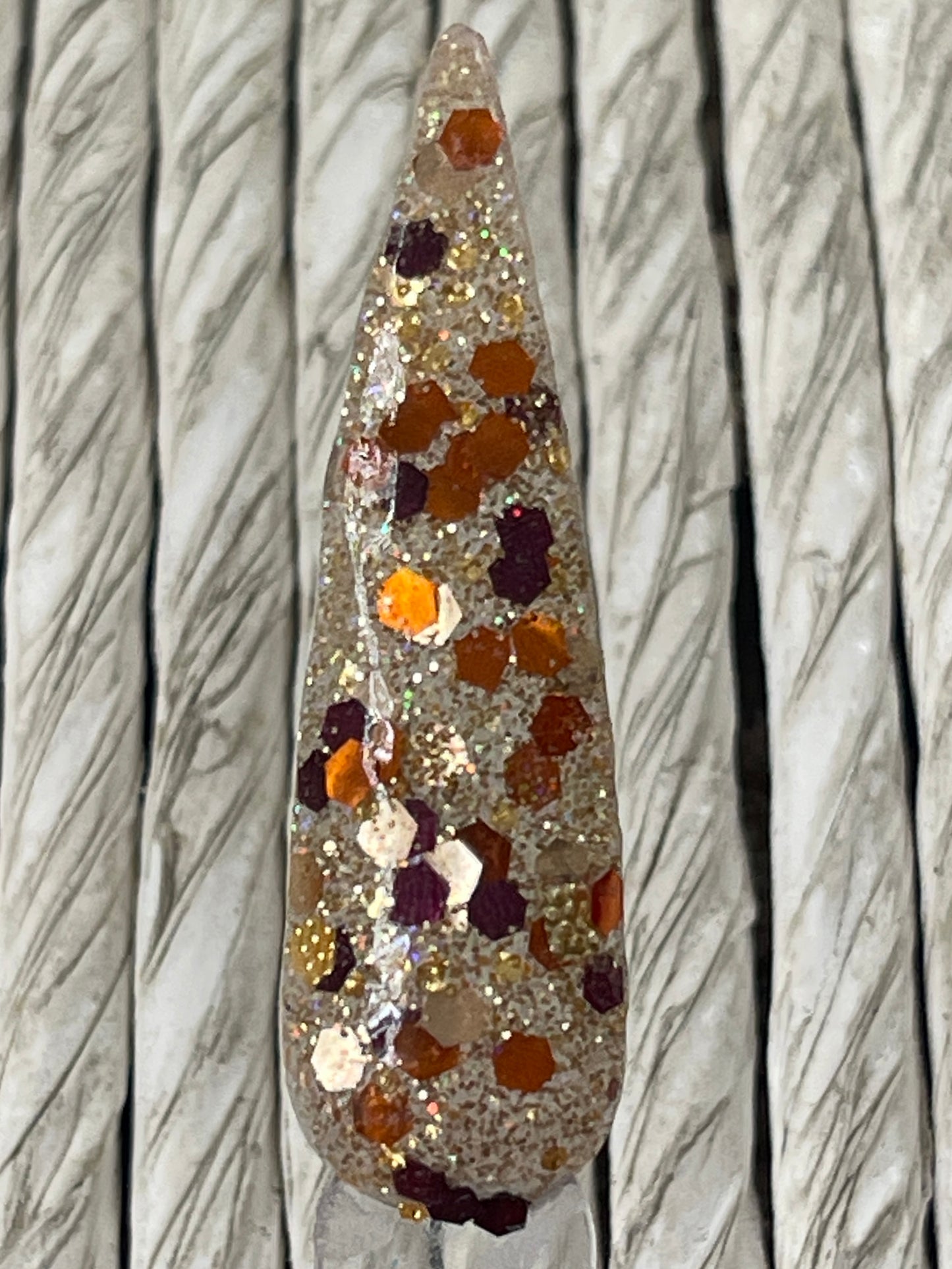 I Like You A Latte is a clear base with a fine champagne glitter and chunky orange/brown and gold glitters