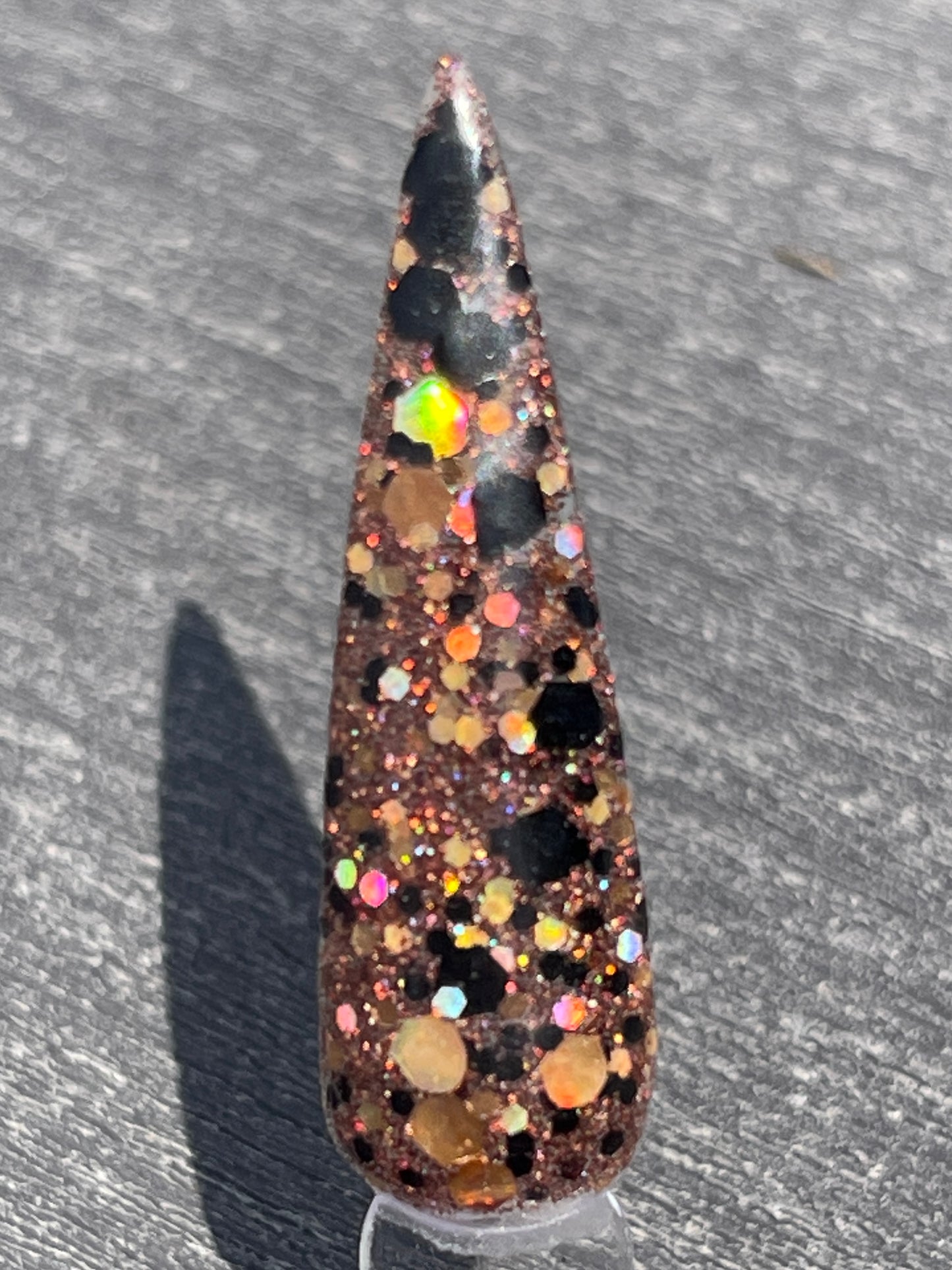 If The Broom Fits is a combination of a fine light brown glitter and chunky gold and black holographic glitter