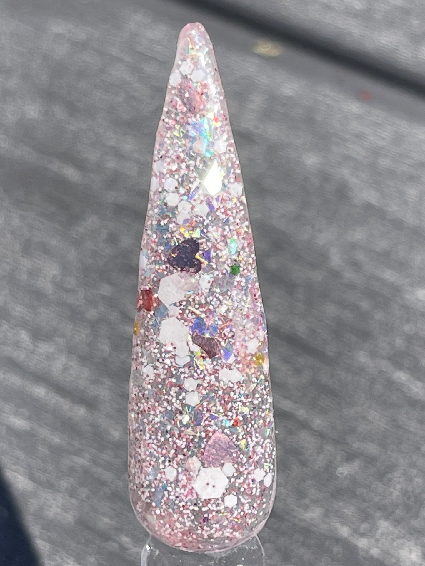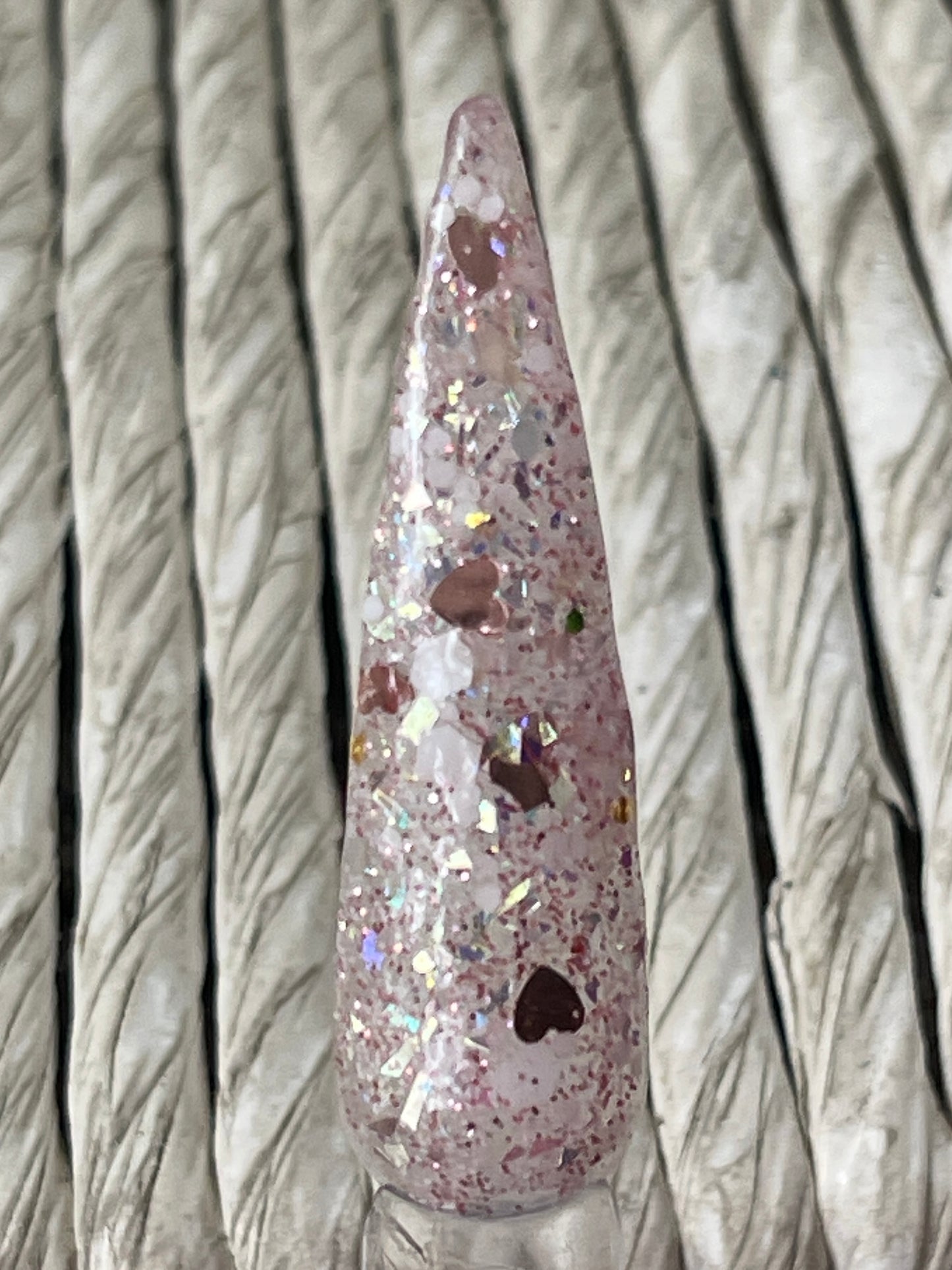 Kiss Me Jack is a clear base loaded w opal chrome flakes and chunky white/pink/heart shaped glitter