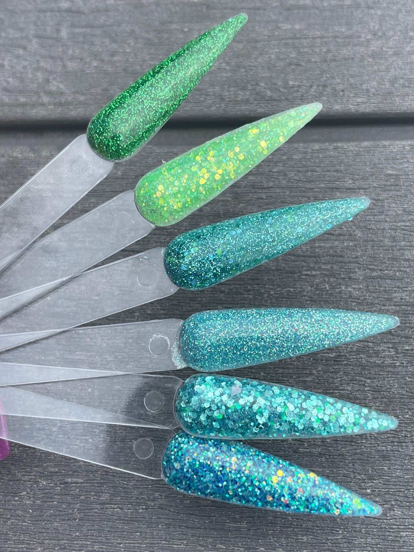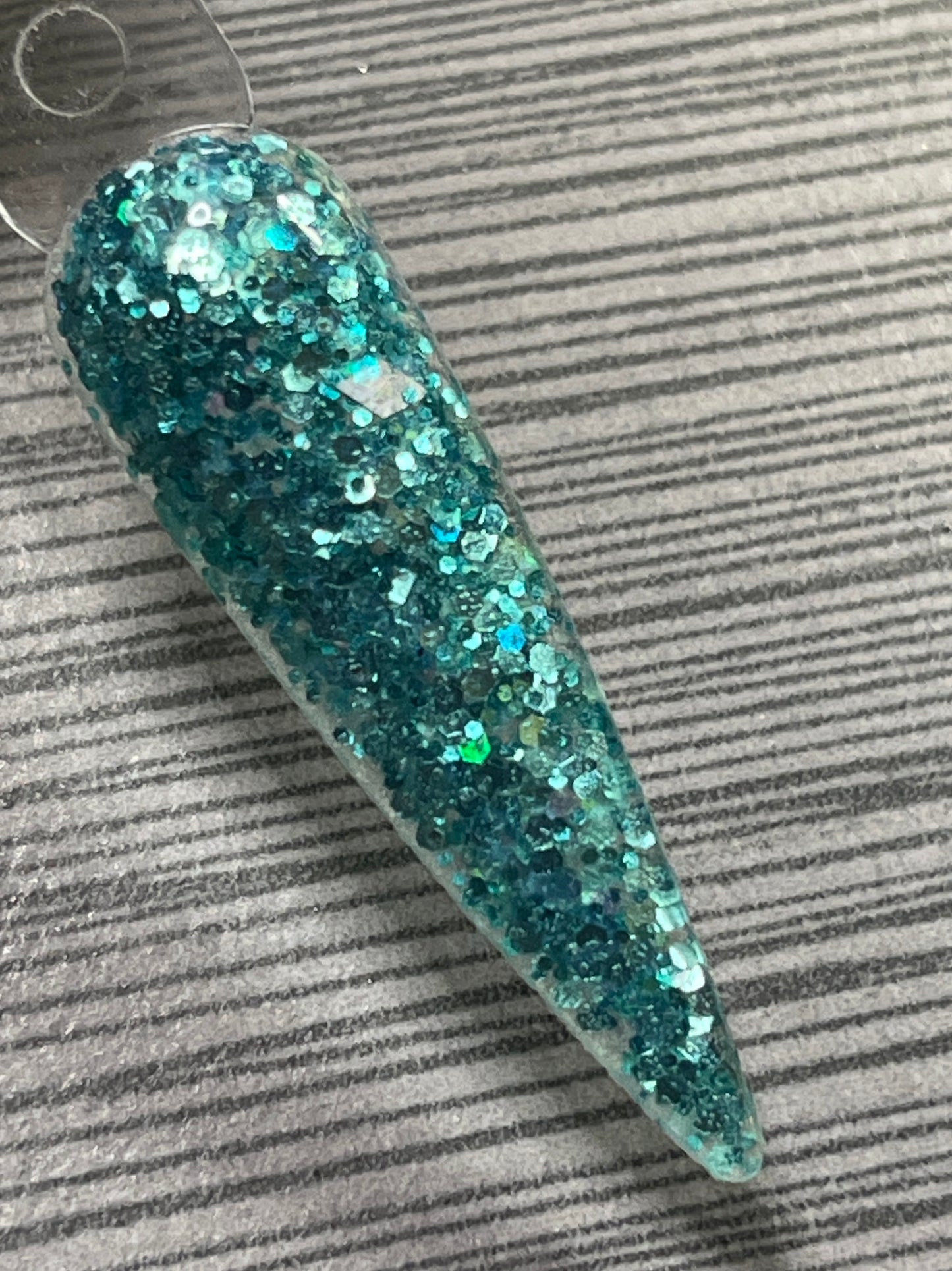 Knock It Off! is a fine Tiffany blue glitter with silver diamond shaped glitter. Glows aqua when charged by uv or sunlight.