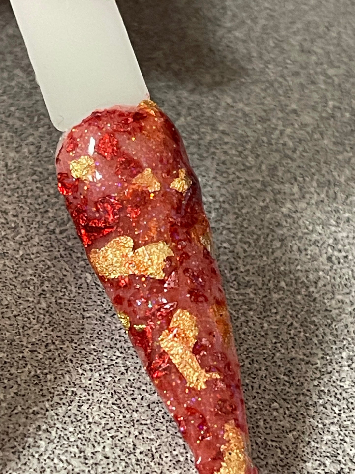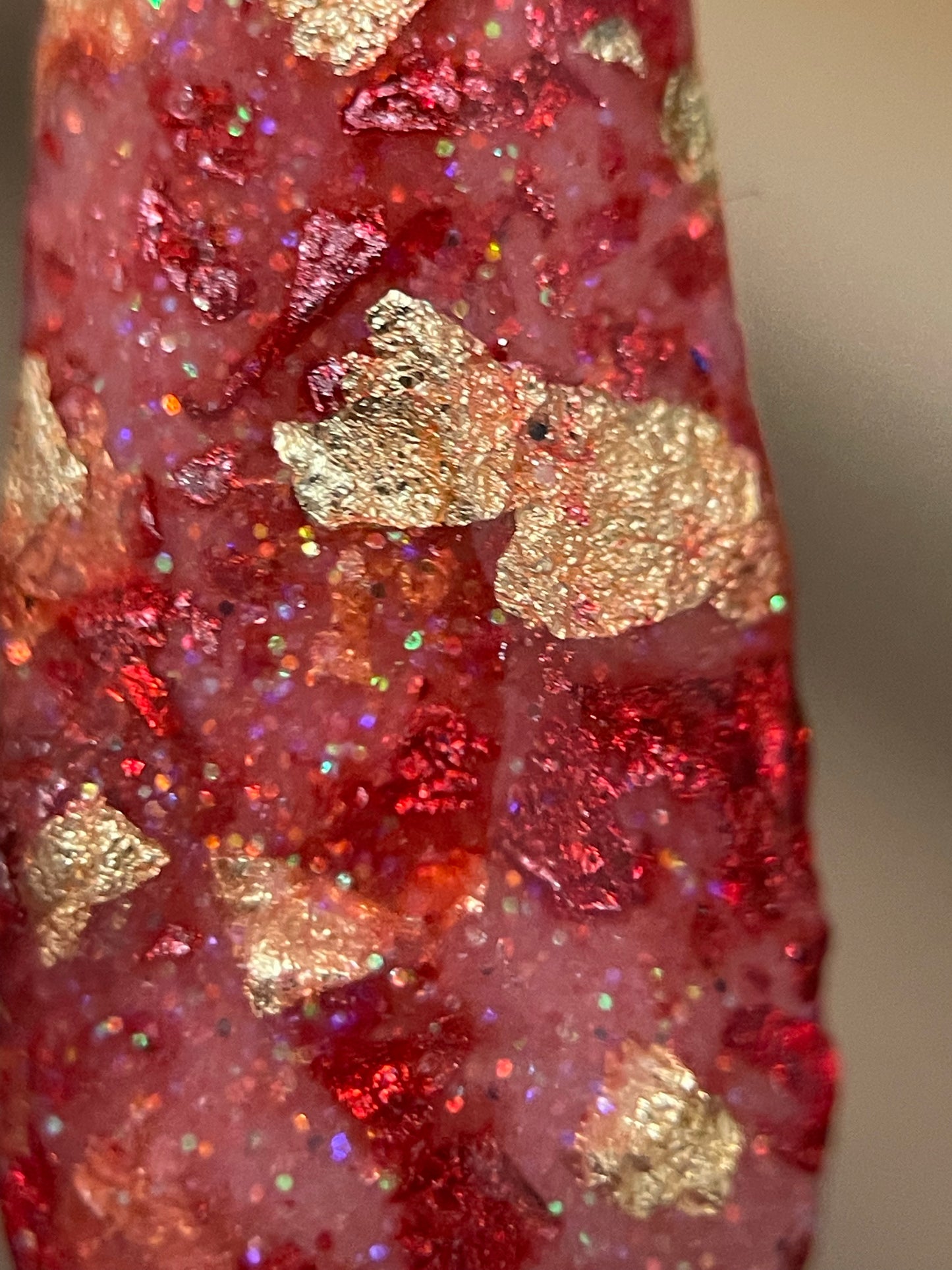 Kuzco is a fine scarlet/red/coral glitter base with red and gold foils