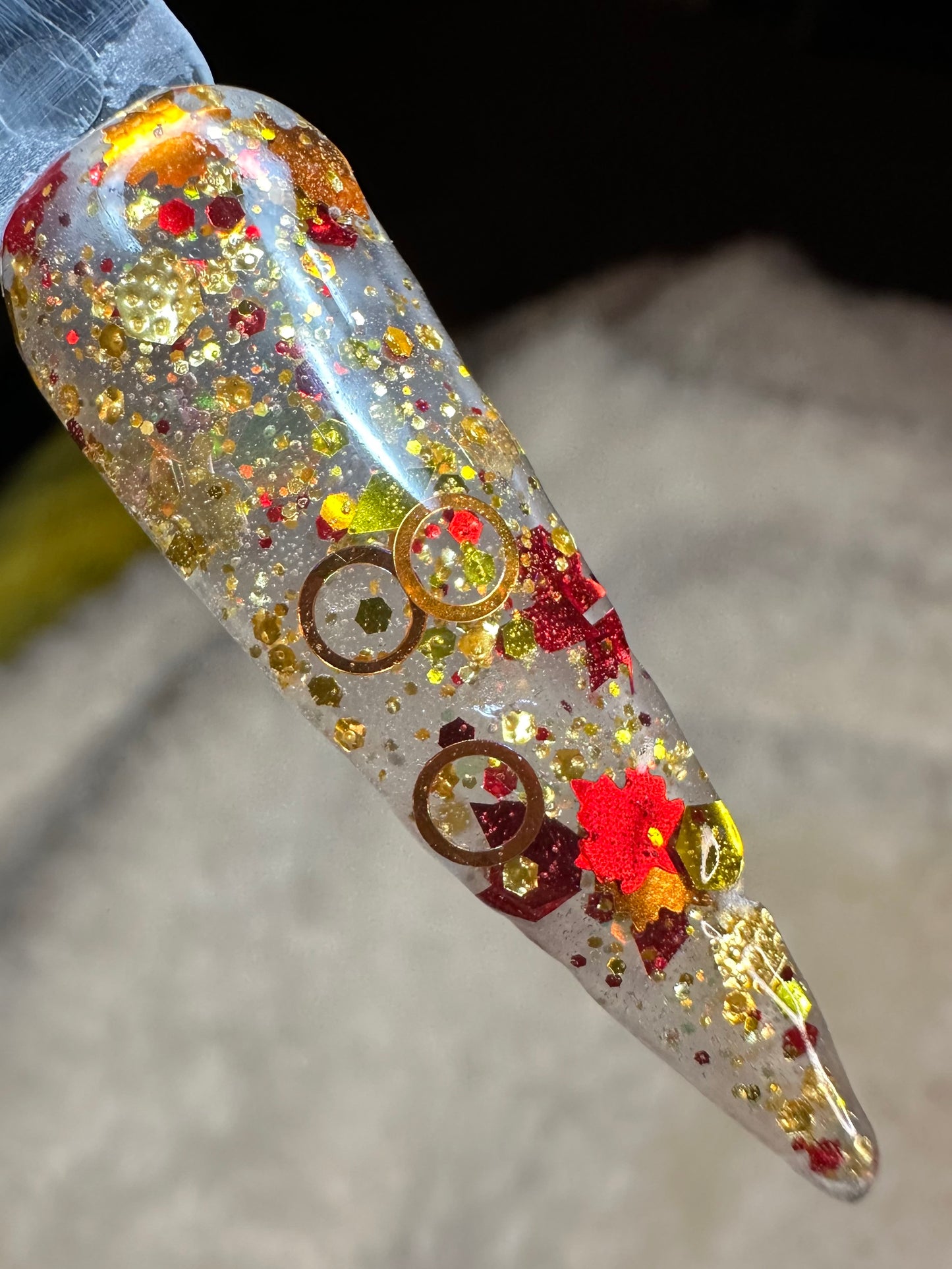 Leaves are Fallin Is a clear base with fall leaves, circles, and gold honeycomb glitter