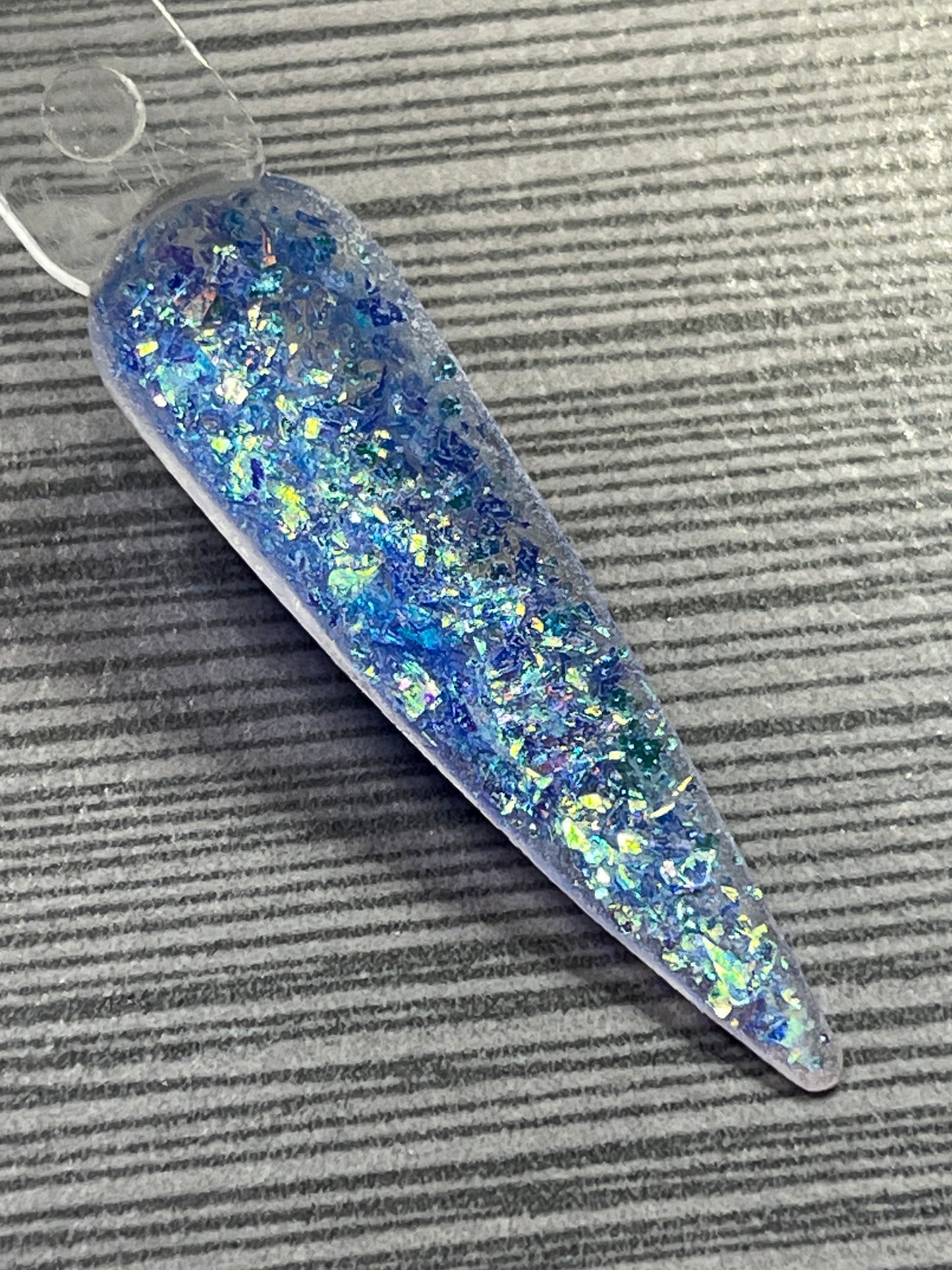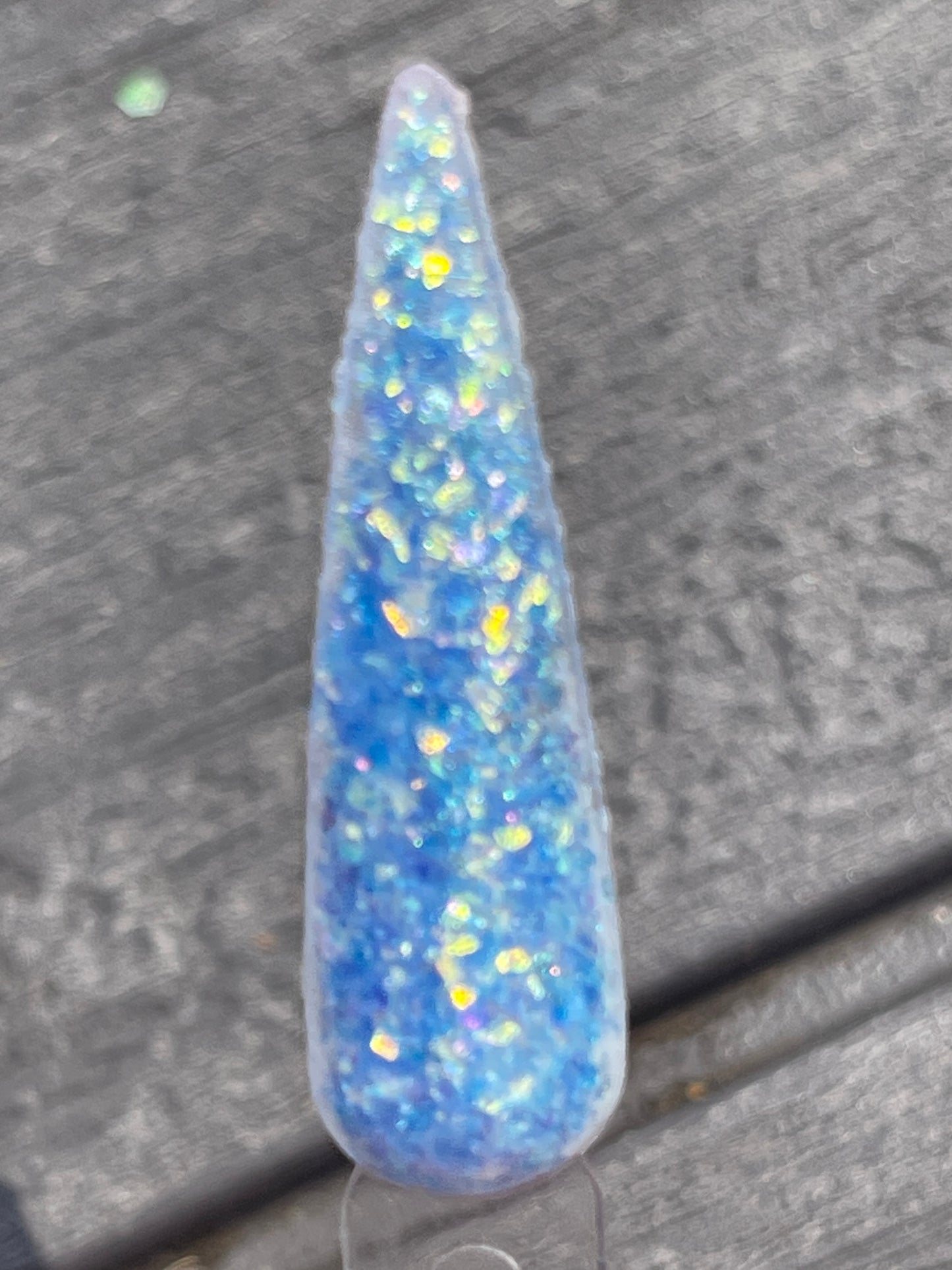 Let Me Sleep In is a clear base with blue flakes, blue waffle and chunky color shifting glitters. Glows blue when charged by uv or sun light.