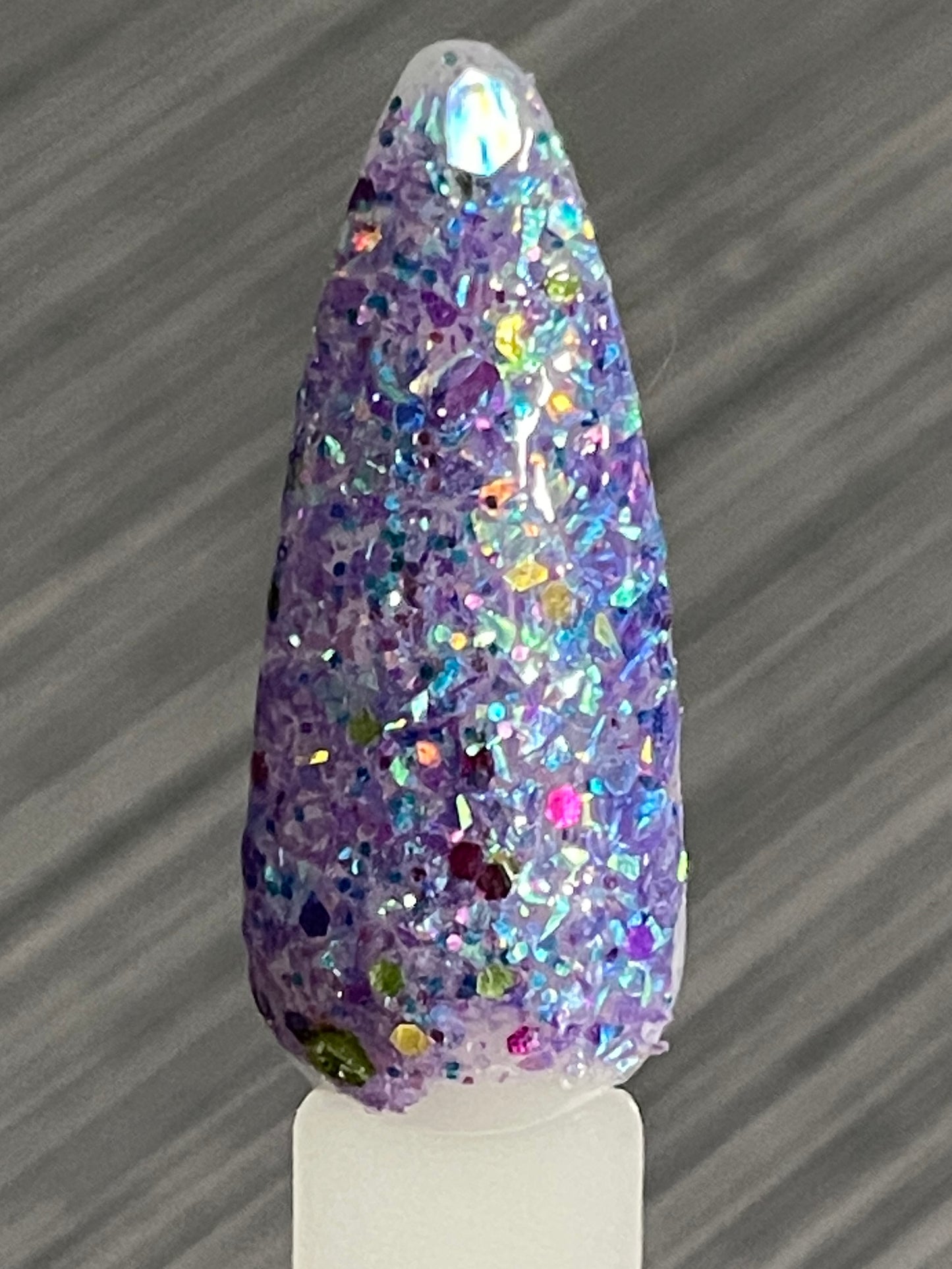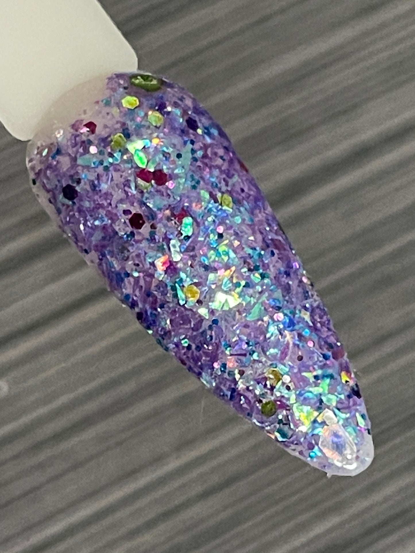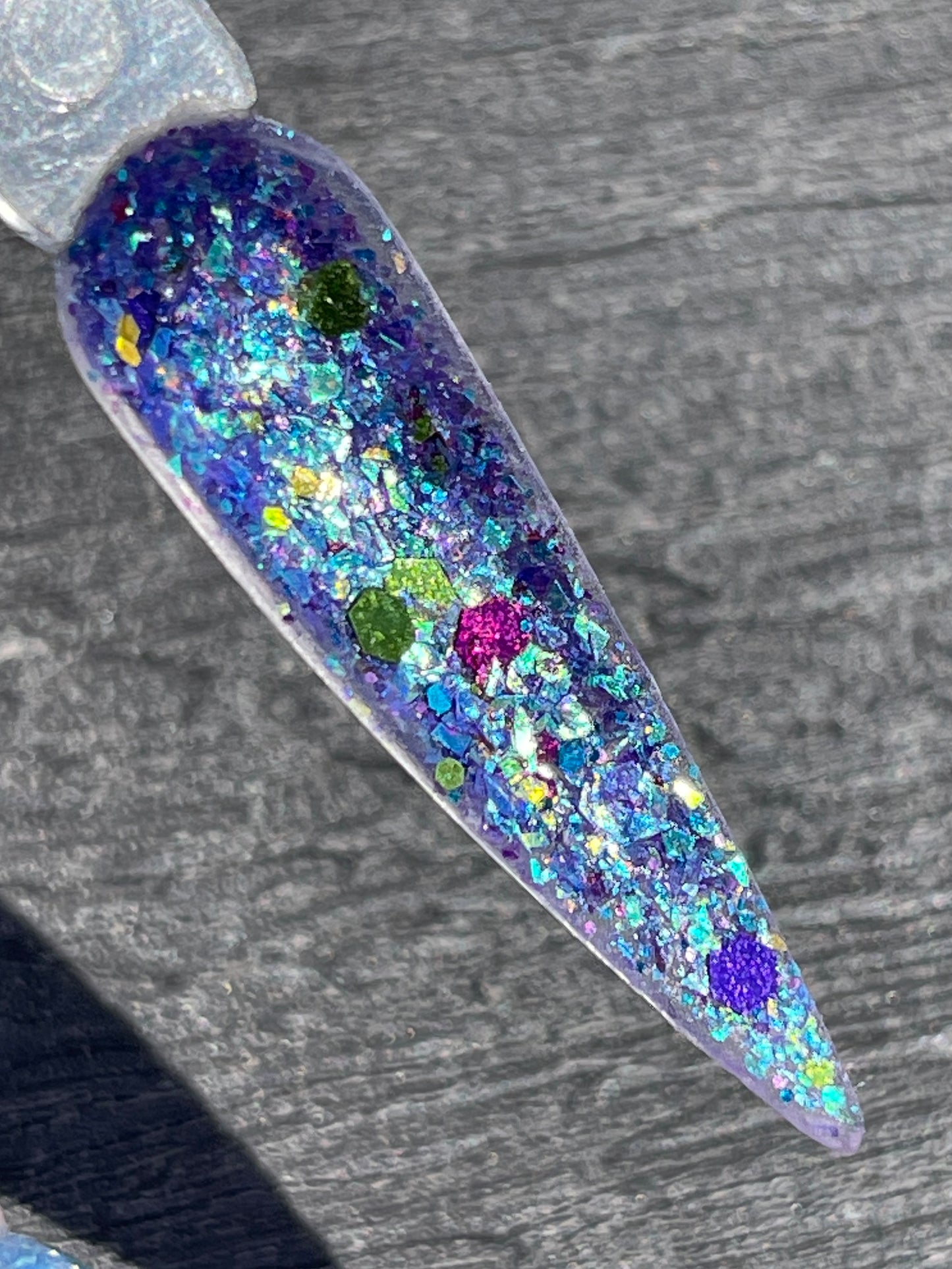 Loose Lips Sinks Ships is a clear base with multi colored chunky glitters and flakes that glows purple/deep blue when charged by uv or sun light