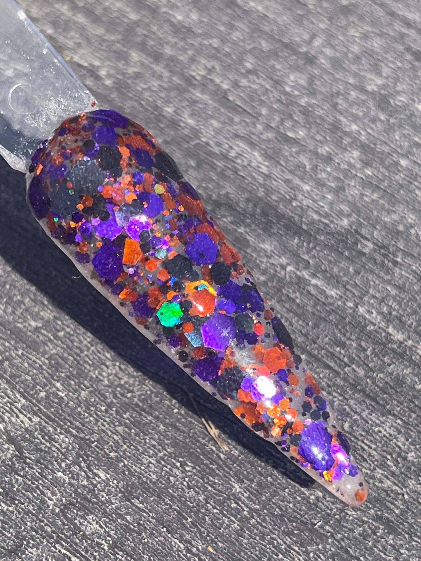 Mischief is a clear base with purple, orange, black, green chunky glitter