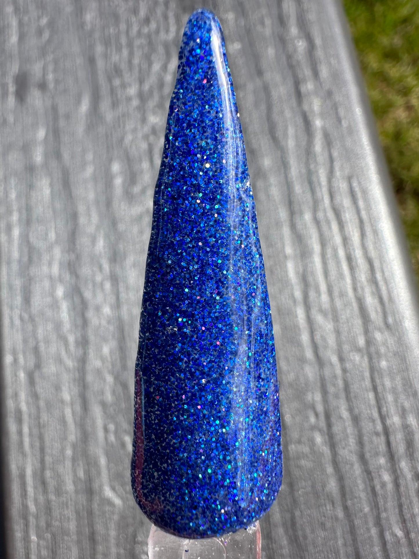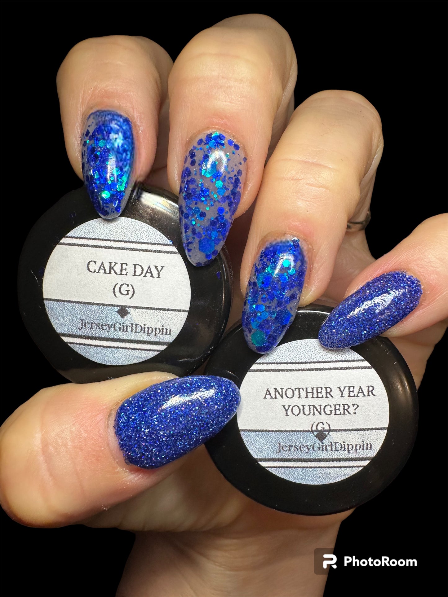 Another Year Younger? Is a navy blue fine holographic glitter that glows when charged by uv or sunlight This is a custom made dip for JGD ambassador Anna birthday 🥳
