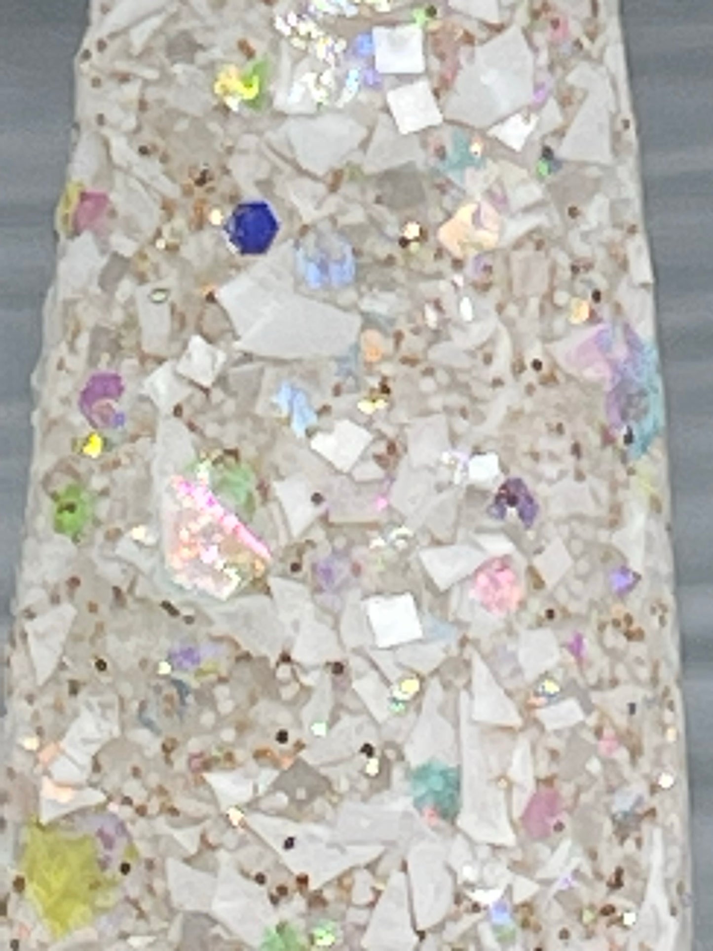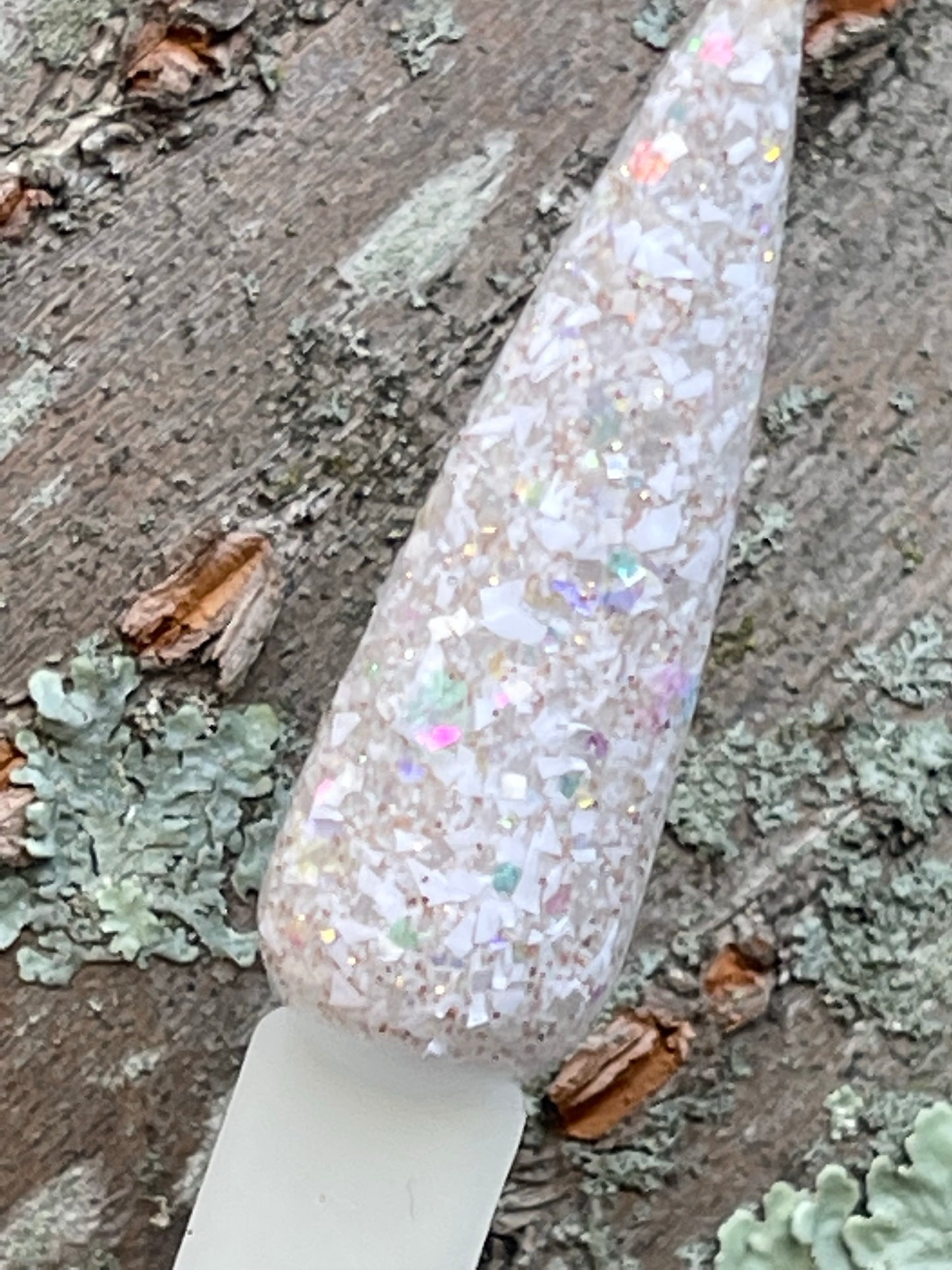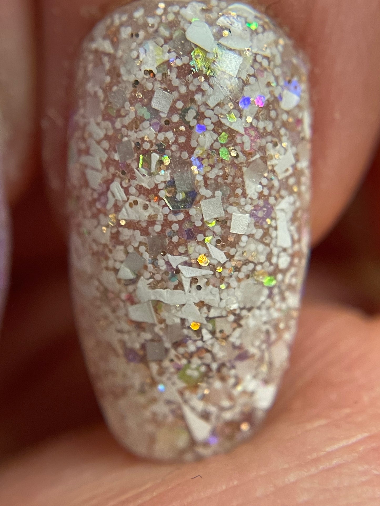 Pillow talk is a clear base with white shard glitter and fine color shifting glitter. It also glows white when charged with uv or under black light
