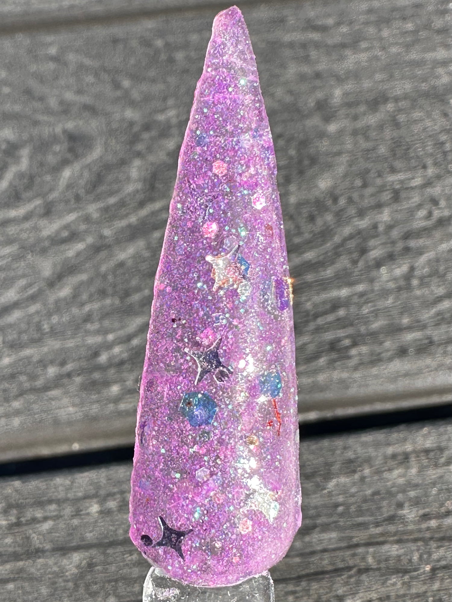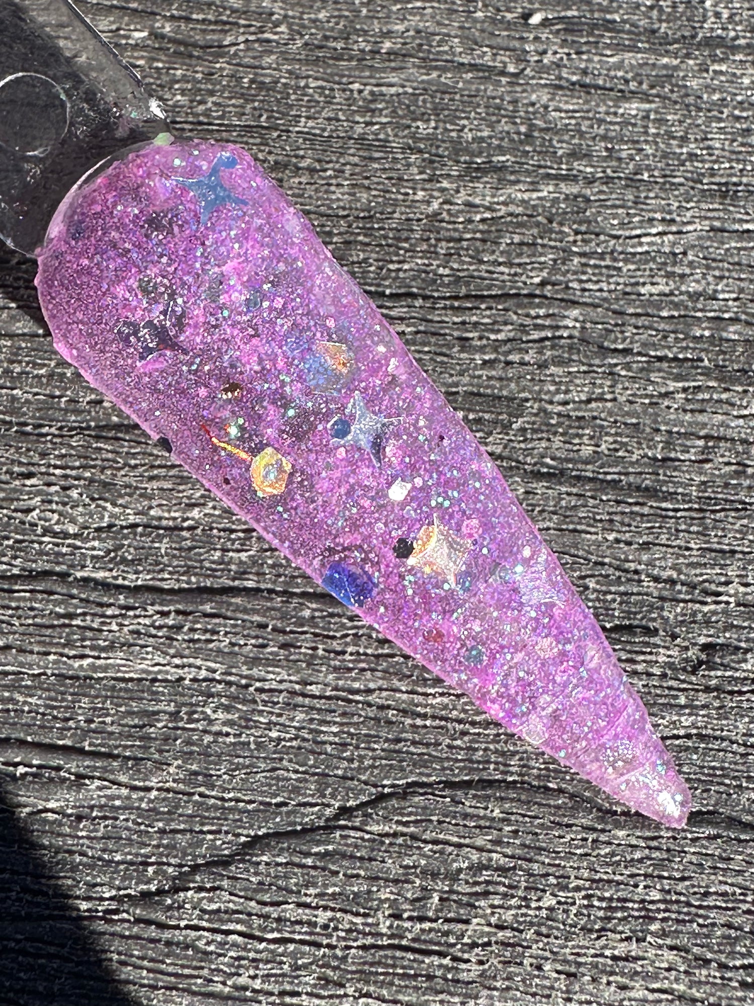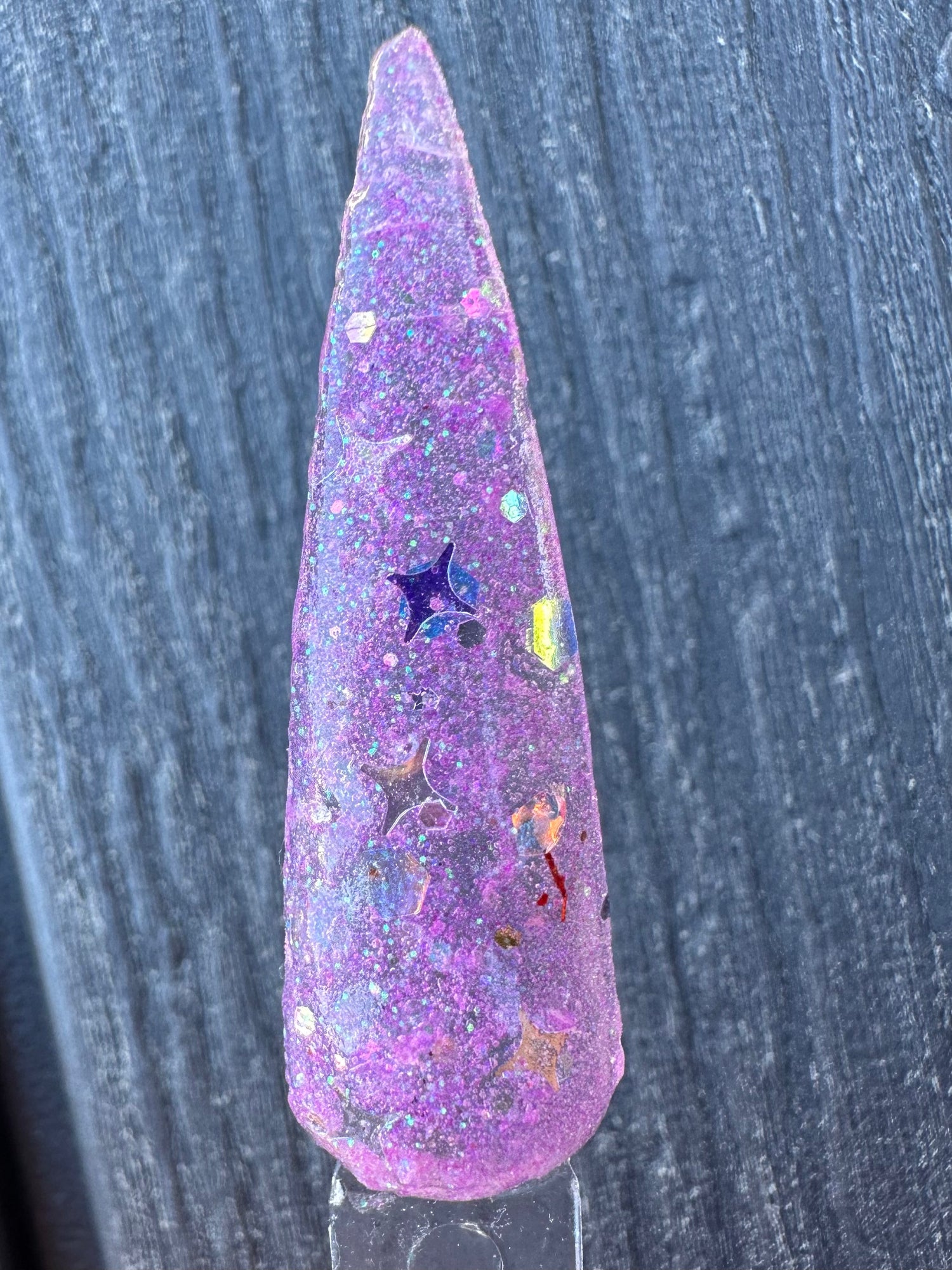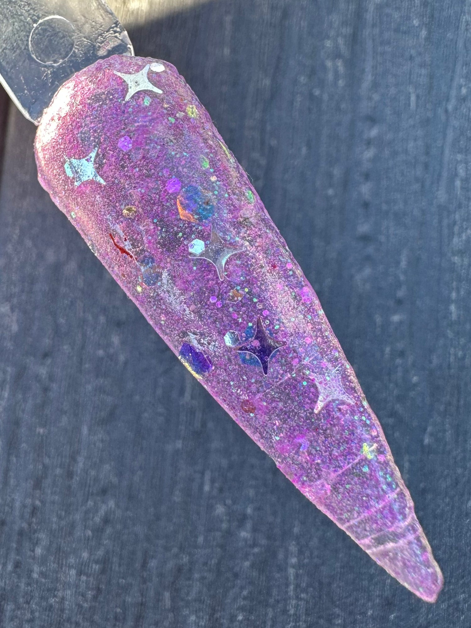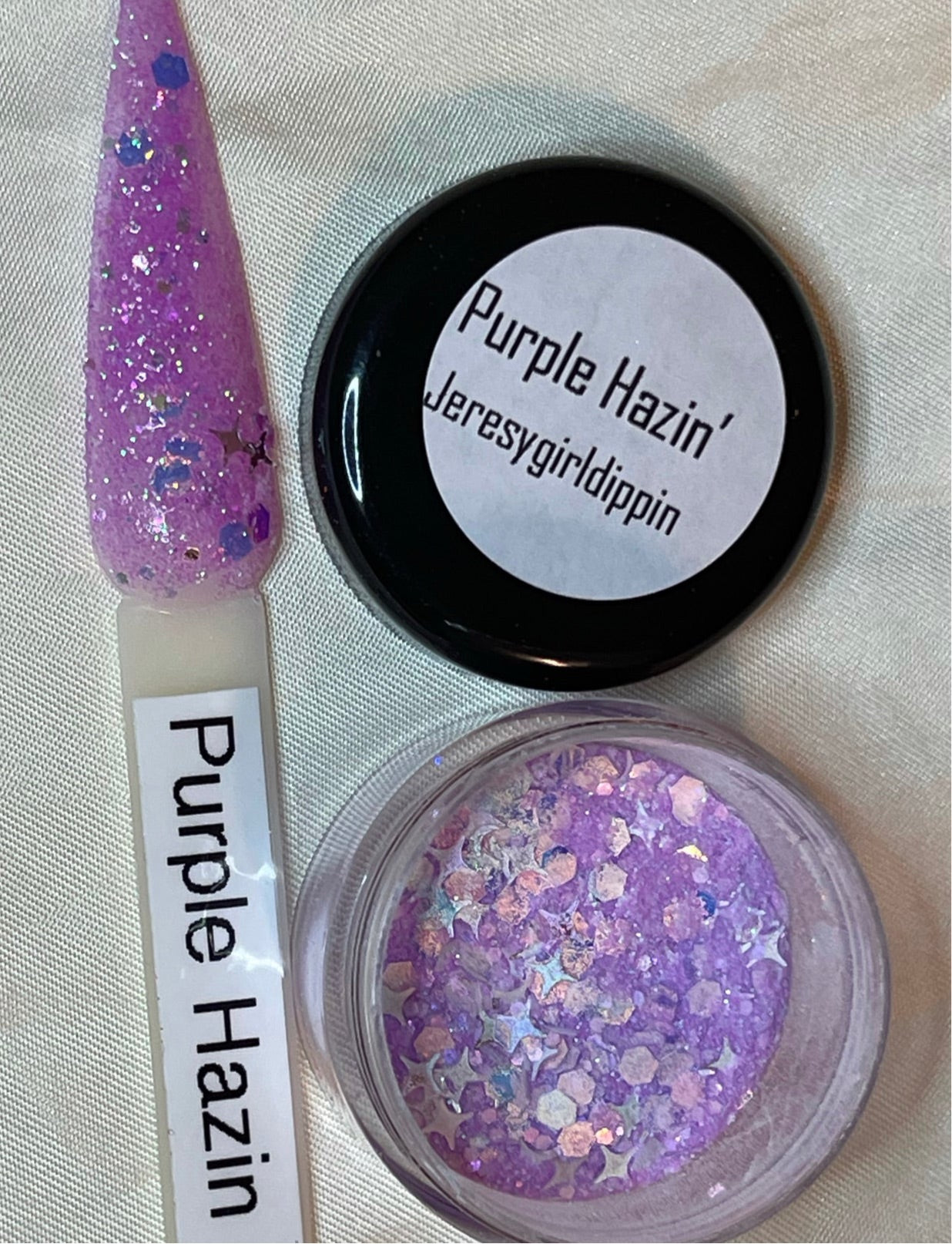 Purple Hazin is a clear base with a fine purple glitter with silver stars that glows when charged by uv or black light