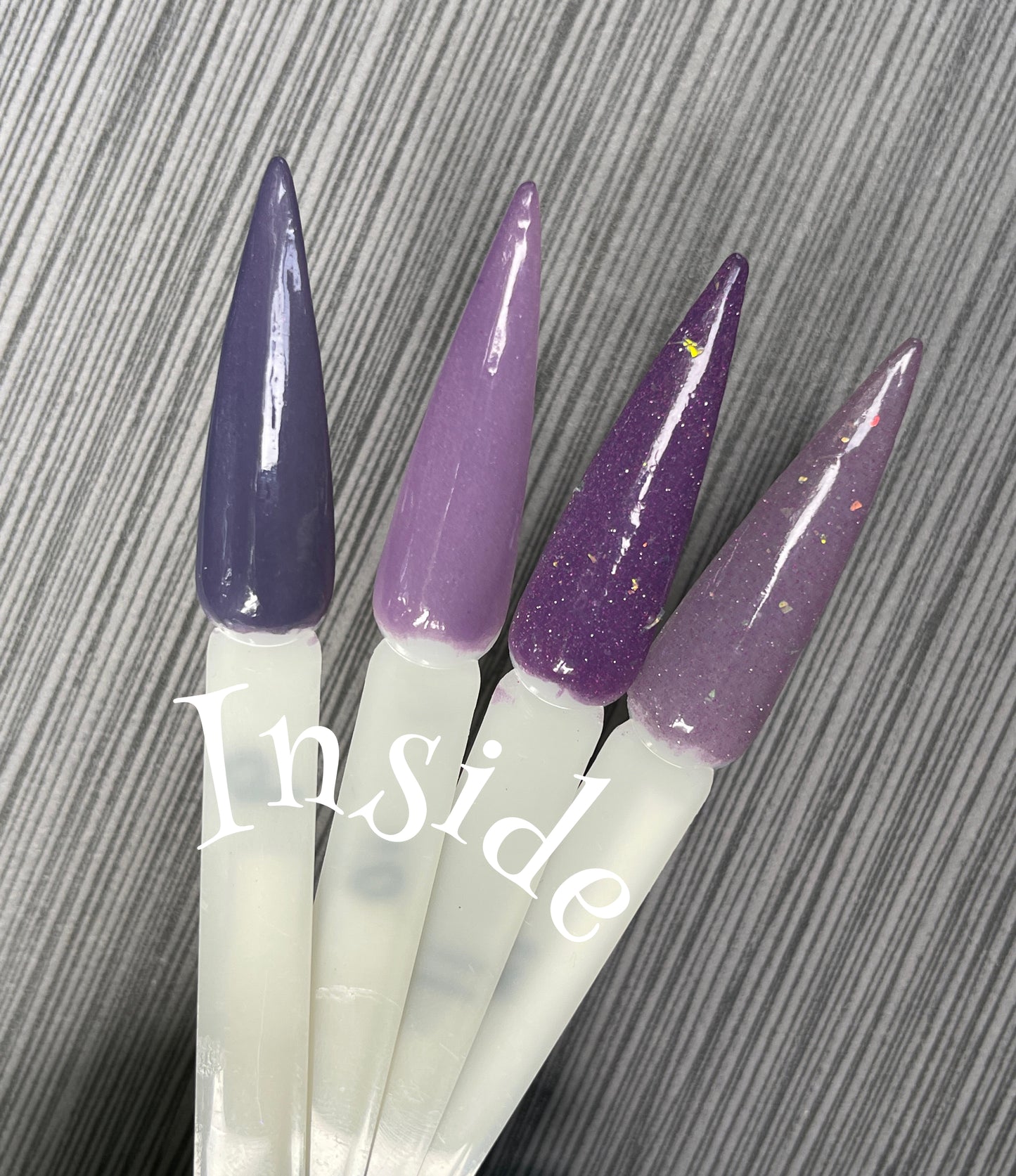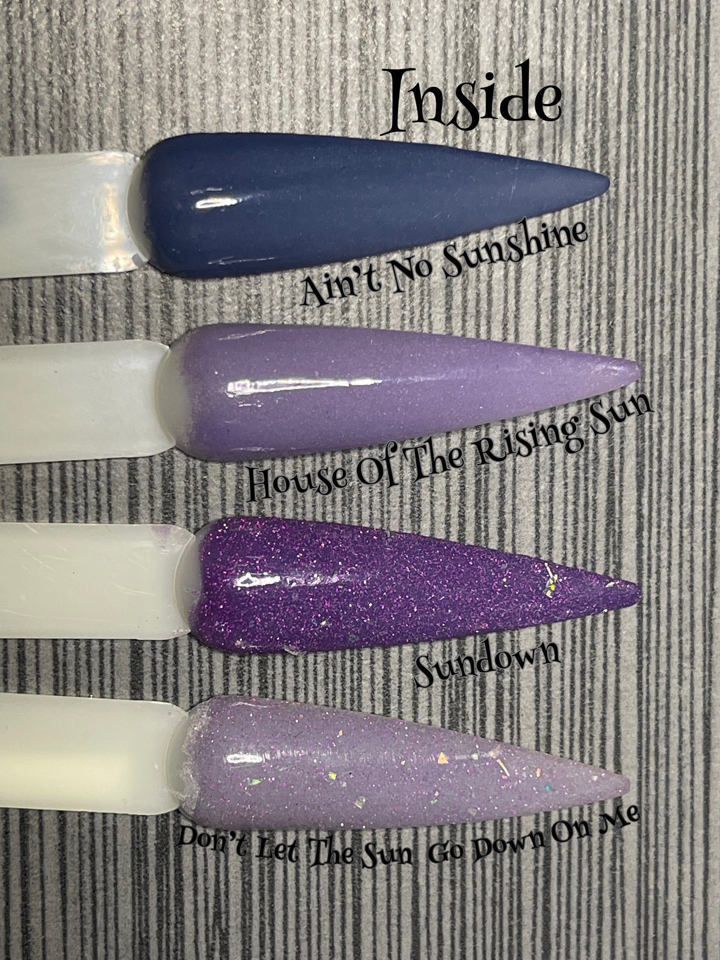 Sundown is a color change from light purple to dark purple in the sun loaded with reflective glitter and flakes . It also glows blueish purple when activated by uv or black light.
