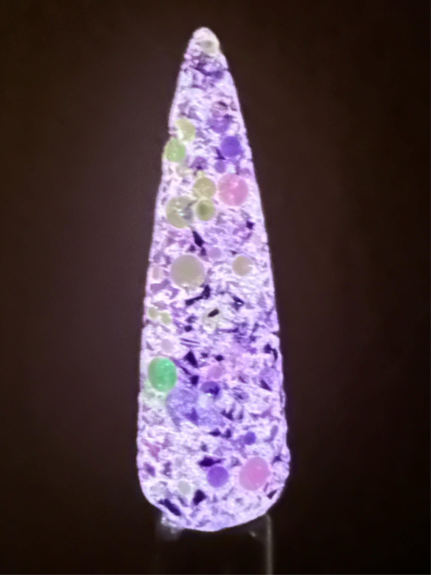 You're A Good Egg is a clear base with pink, yellow, purple and green dots and purple flakes that glows light pale purple when charged by uv/ black light