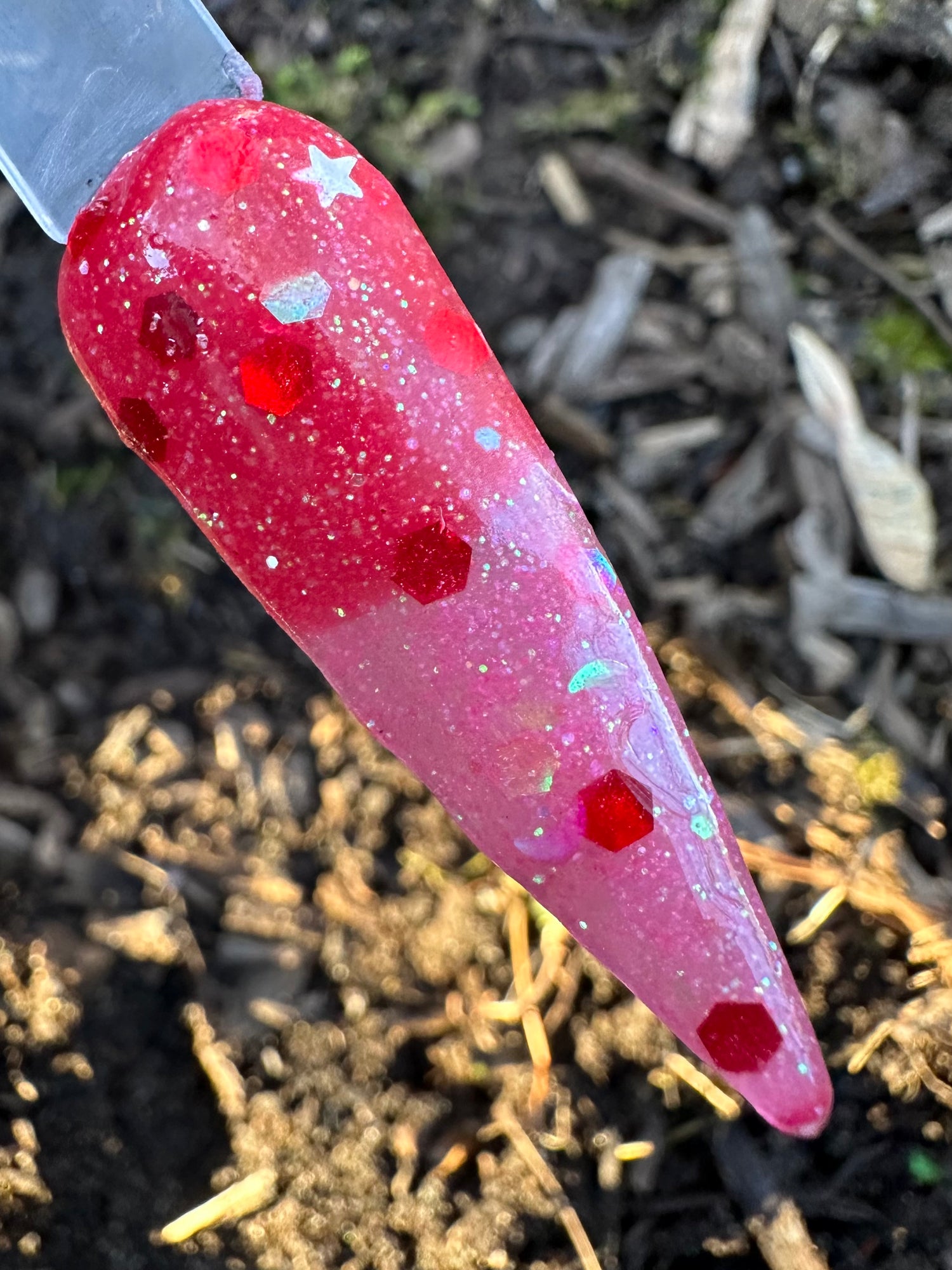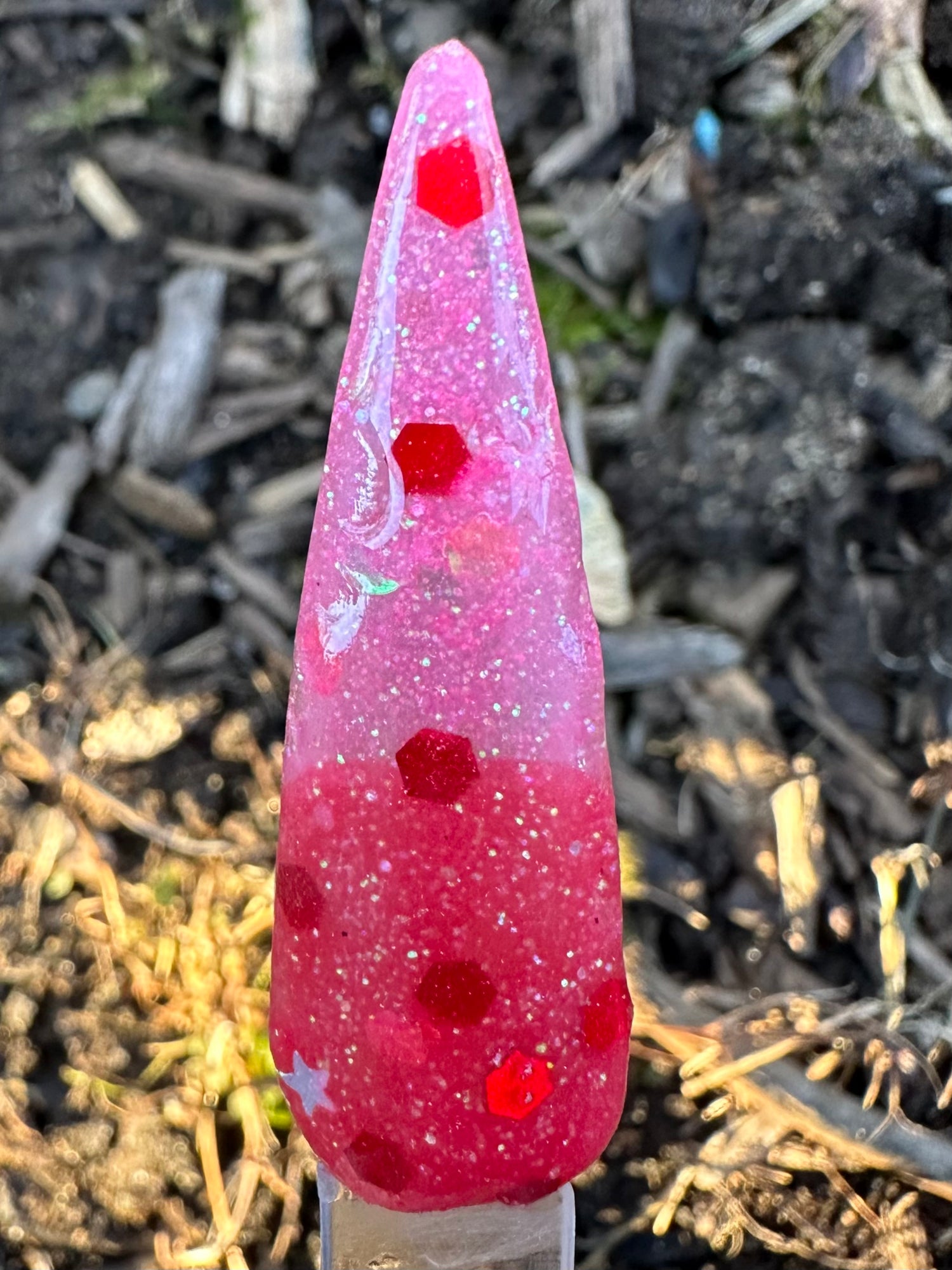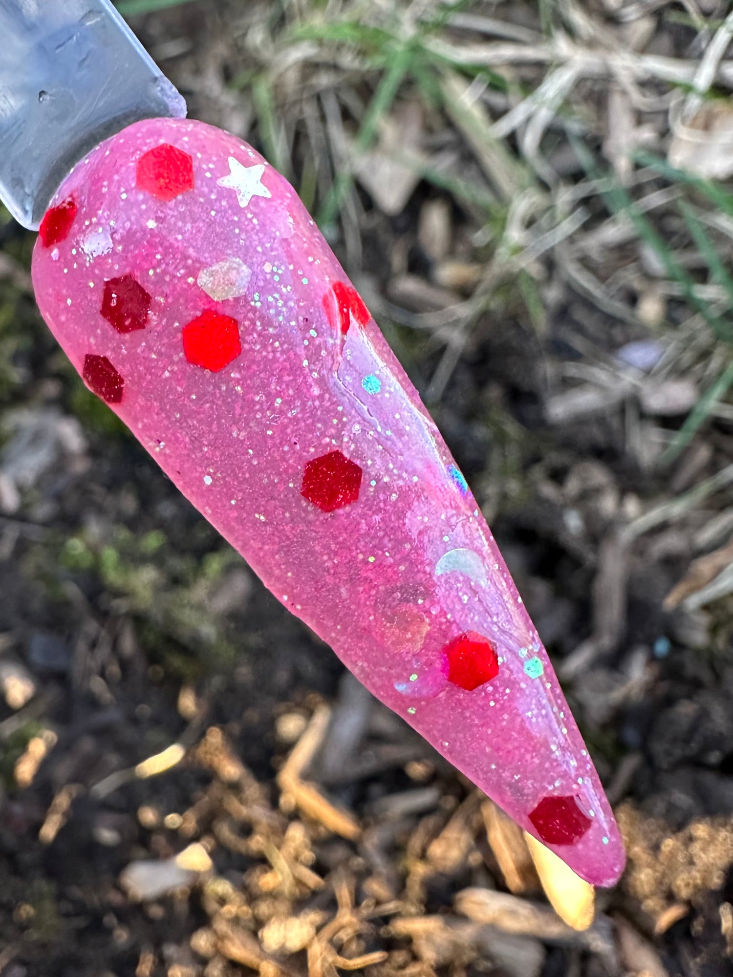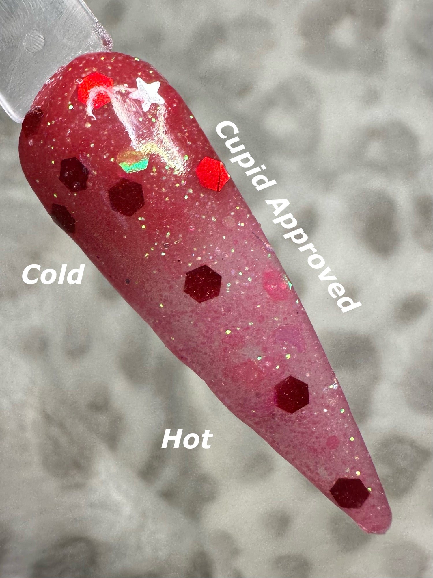 Cupid Approved is a heat activated triple thermal that changes from Scarlet/Red/Pink with chunky red glitter, stars and fine color shifting glitter.