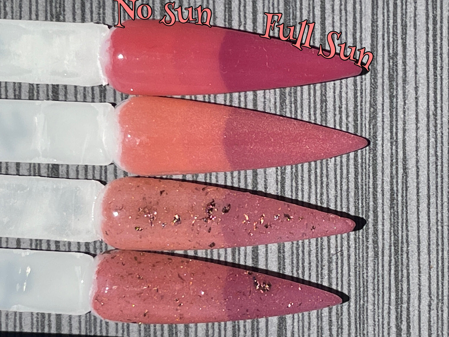 Face The Sun is a color change from peach to violet in the sun loaded with reflective glitter and flakes.