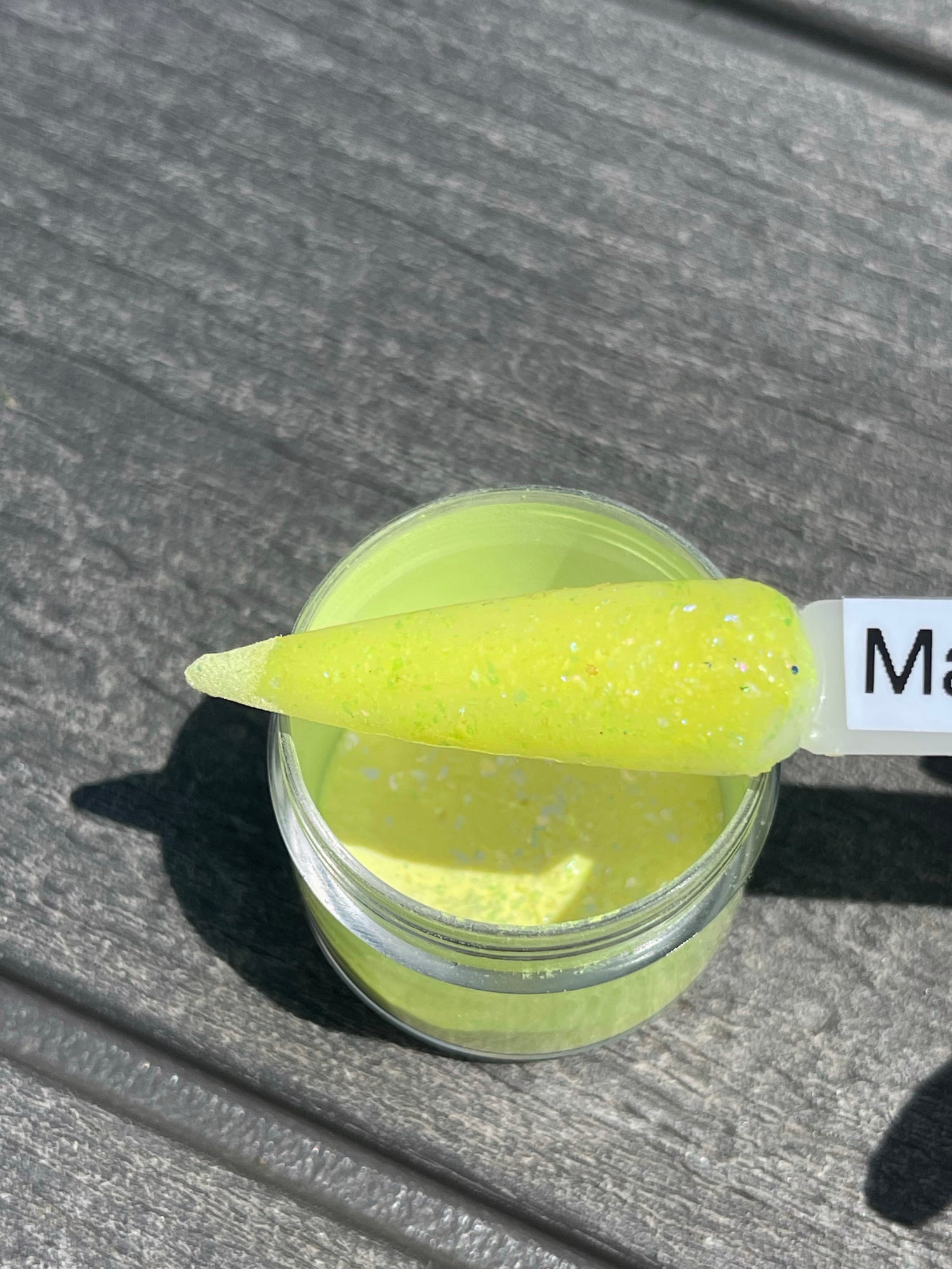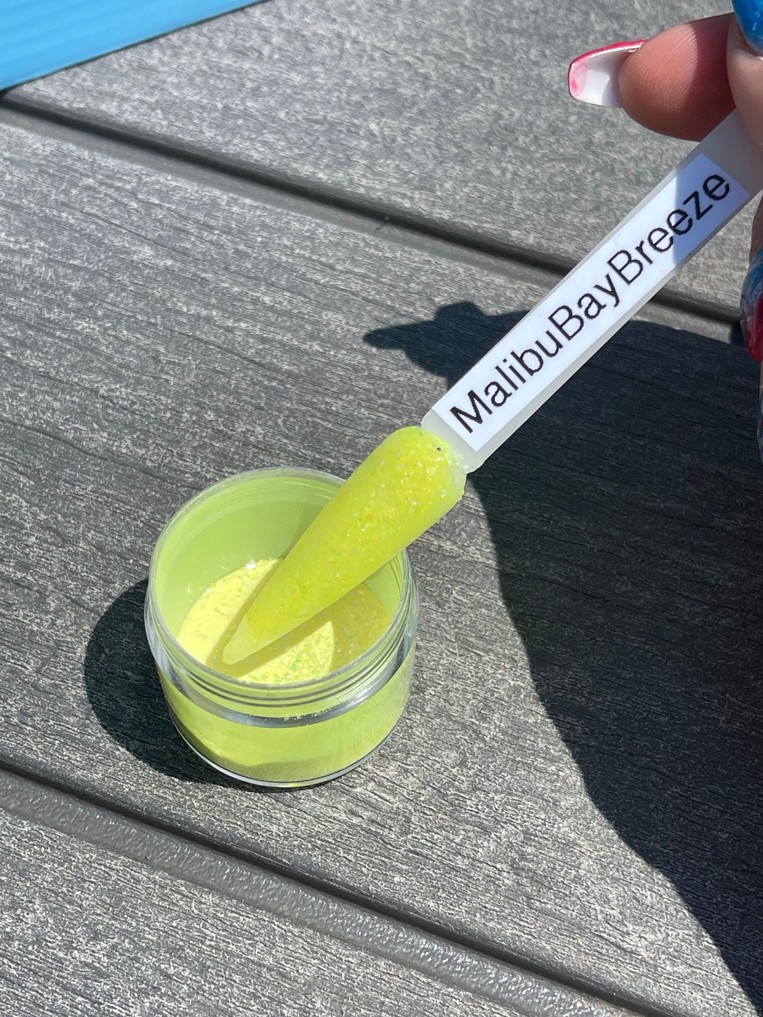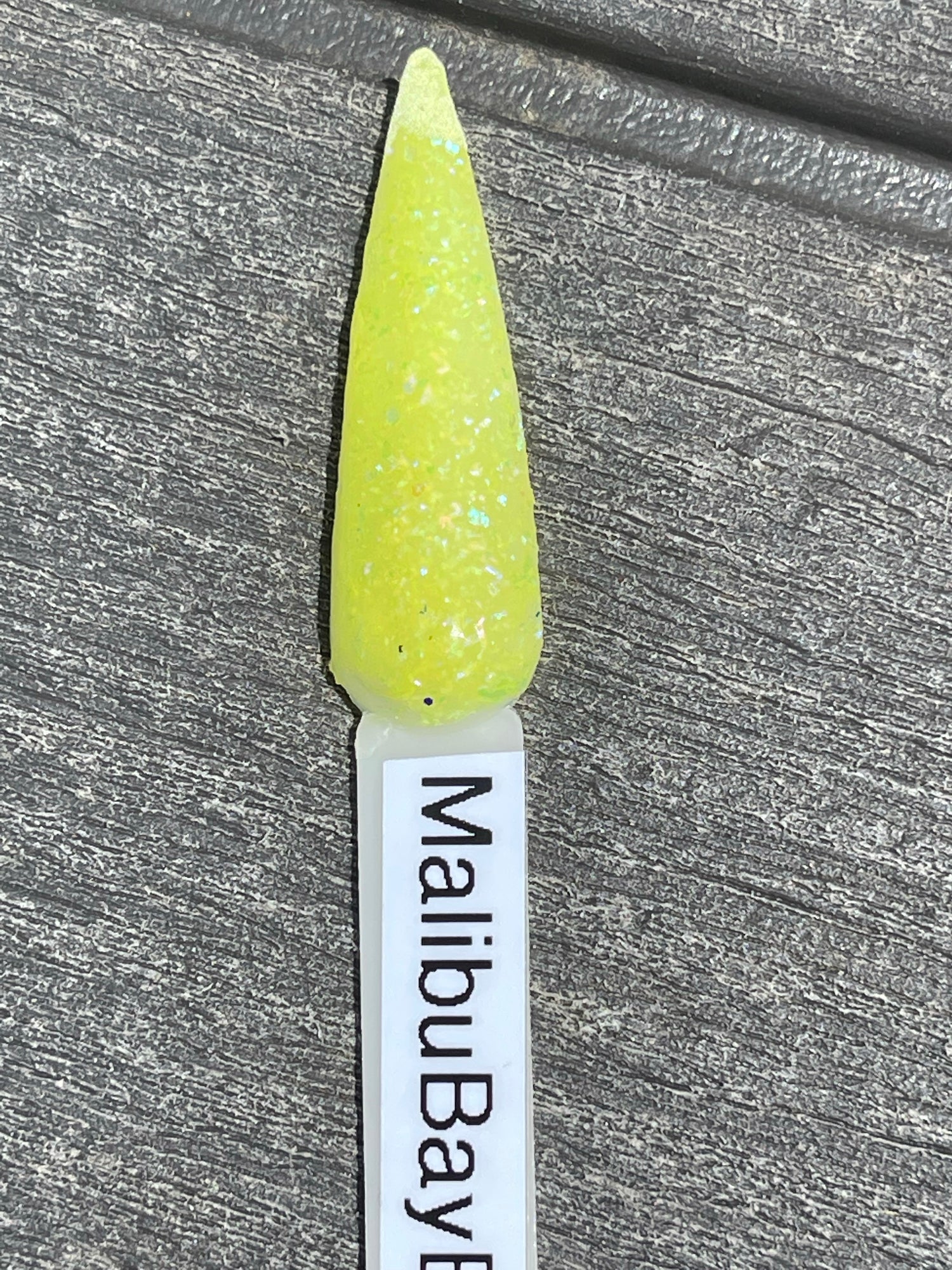 Malibu bay breeze is a bright yellow dip loaded with multi colored chroma flakes that changes to red when cold