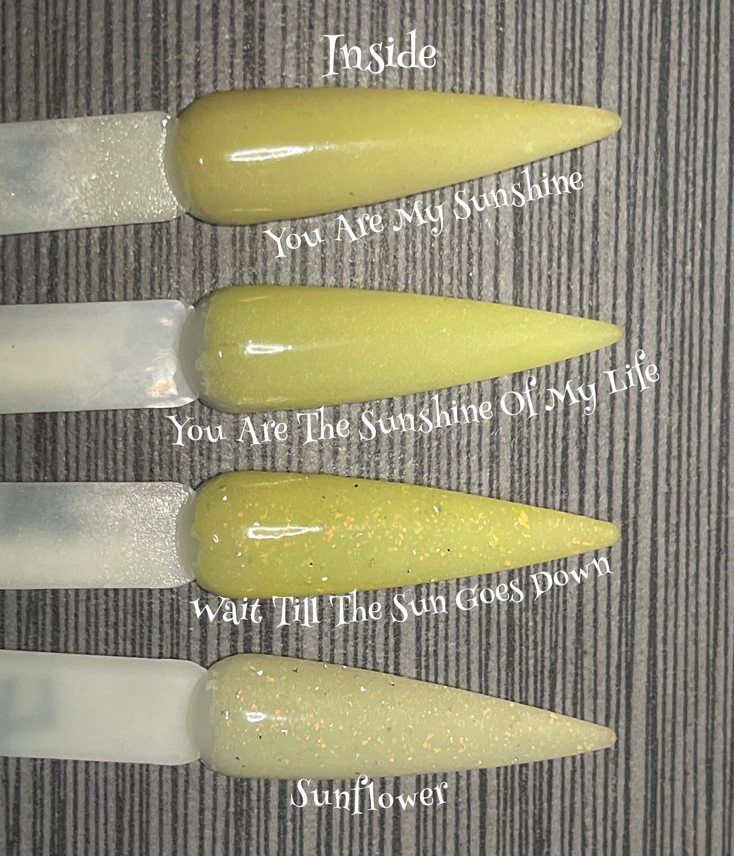 Sunflower is a color change from yellow to purple in the sun loaded with reflective glitter and flakes.